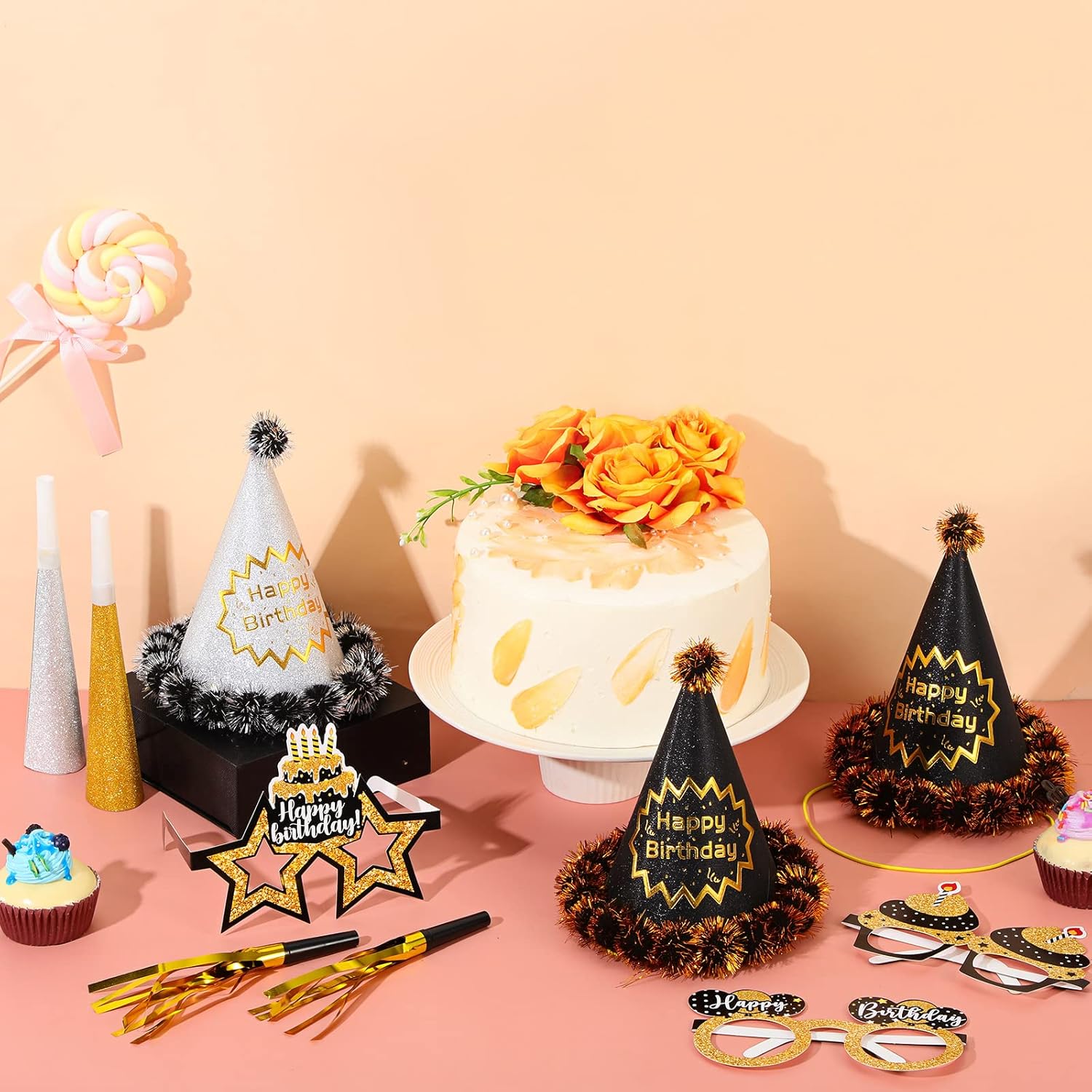 Sratte 36 Pcs Black Gold Style Birthday Party Favors Set Happy Birthday Hat Headband Glasses Noise Makers Party Horns