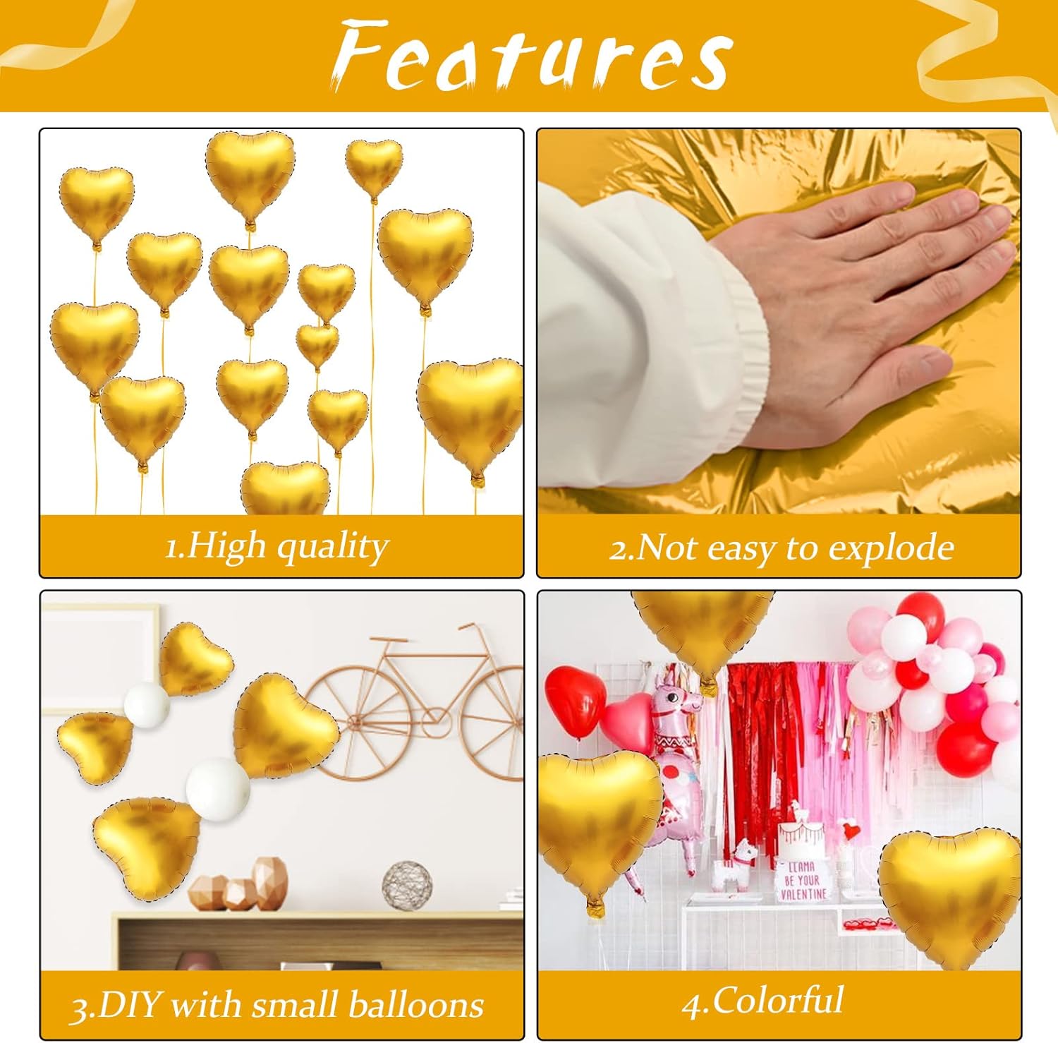 • πŸ’– 10 PCS GOLD FOIL HEART BALLOONS: Package contains 10 x 18 inch gold heart balloons, 1 x 10m ribbon.The gold heart shape balloons are specially shaped, the perfect size for your holiday or party decorating needs, together create a fun and surprising party, leave an unforgettable smile!