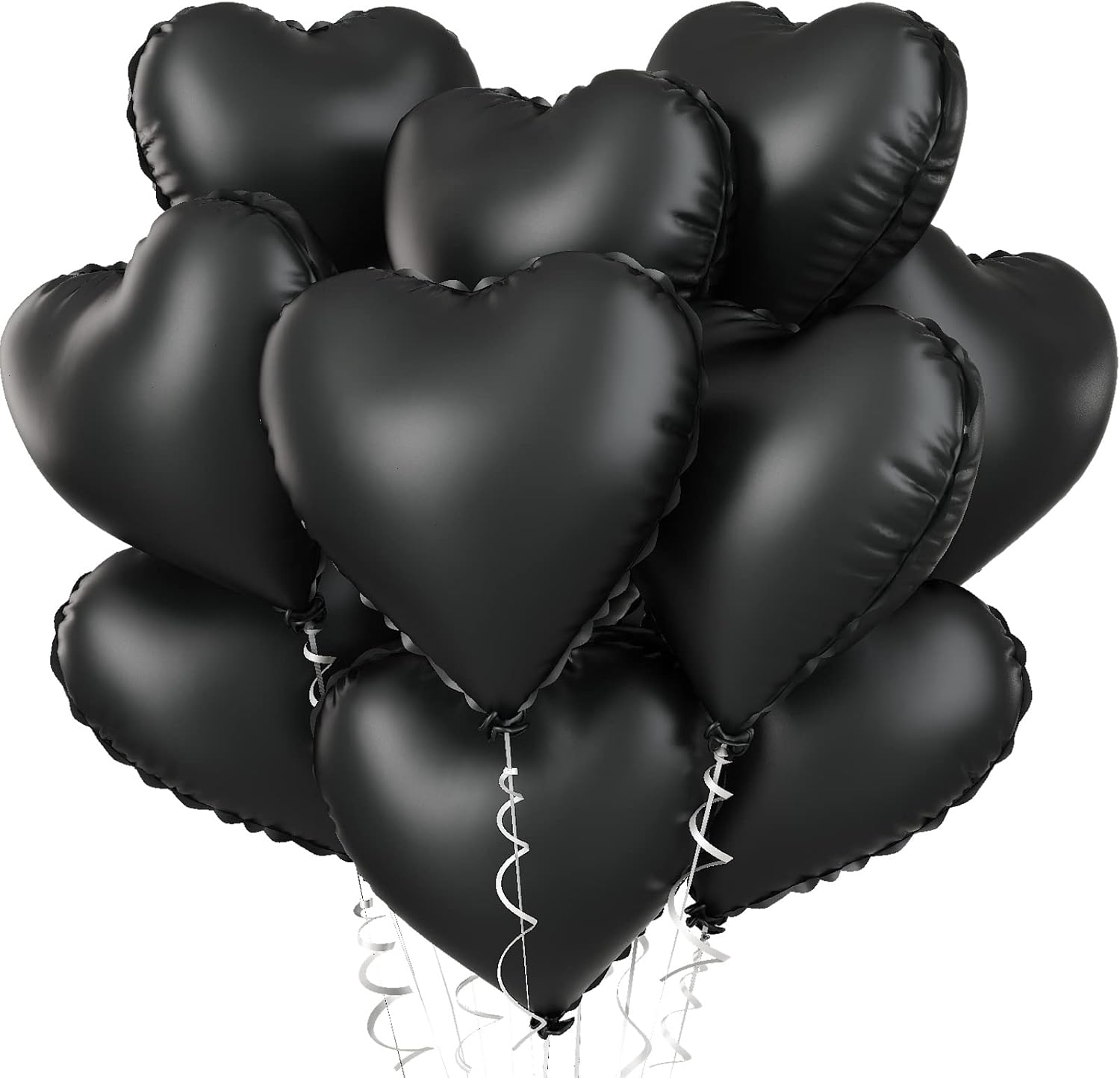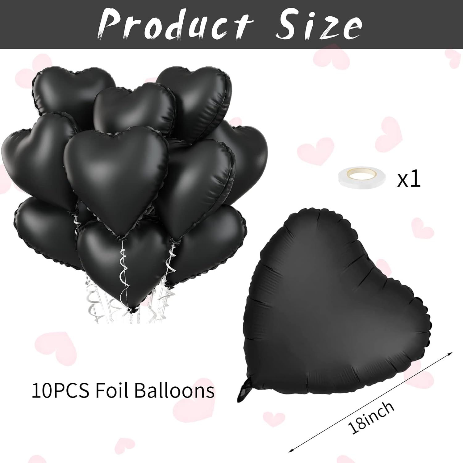 • πŸ’– 10 PCS BLACK FOIL HEART BALLOONS: Package contains 10 x 18 inch black heart balloons, 1 x 10m ribbon.The black heart shape balloons are specially shaped, the perfect size for your holiday or party decorating needs, together create a fun and surprising party, leave an unforgettable smile!