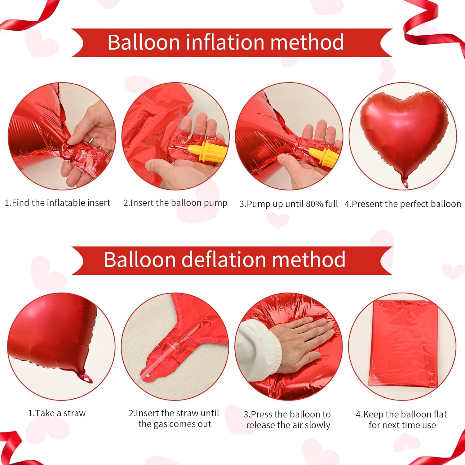 • πŸ’– EASY TO USE: These red heart birthday balloons can be filled with air and helium (Inflate to 85%-90%, in case it is too large and explodes).The valve seals automatically when inflated, the gas inside can be emptied with a plastic straw, which can be reused later.Red valentines balloons set have 10 meters ribbon, you can decorate your room with balloons for your children and spouse.
