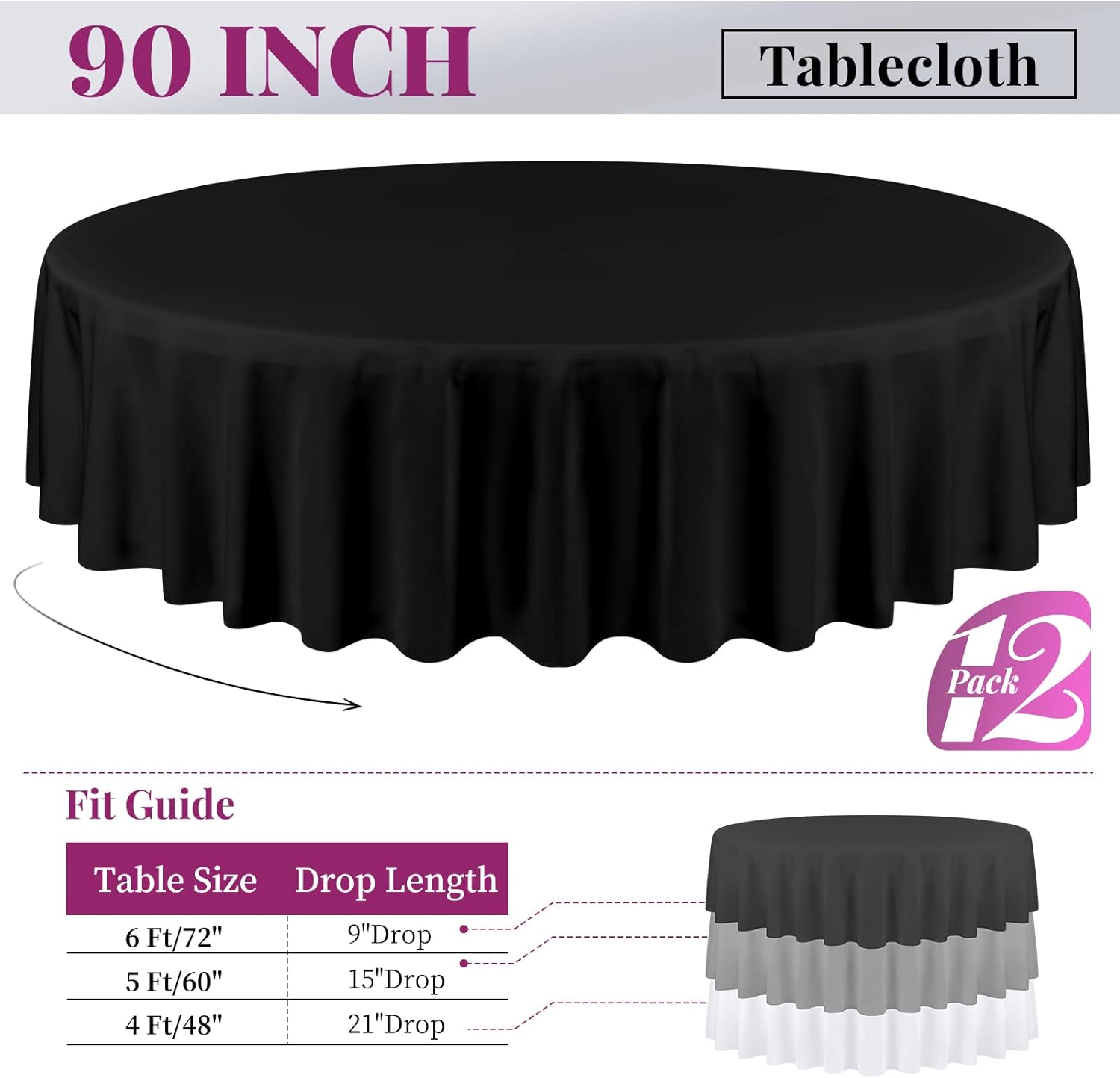 • 🥂【Premium Tablecloth Fabrics】You can get 12 pieces 90 inch Black round tablecloth, our tablecloth is made of soft premium polyester fabric that resists wrinkling for an always crisp, polished look. These materials are as skin-friendly as they are environmentally friendly. Protect and decorate your tables.