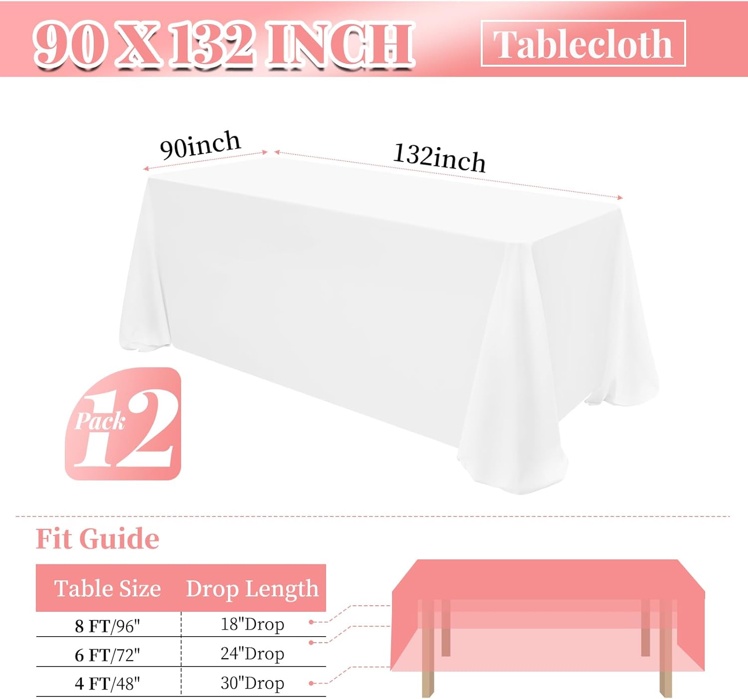 • 【Size】This white table cloth is 90 x 132 Inch, for standard 8ft table, providing 18 inch drop. White table cover is more luxurious, classic and gracious, for both formal & casual settings and makes a great for all occasions.