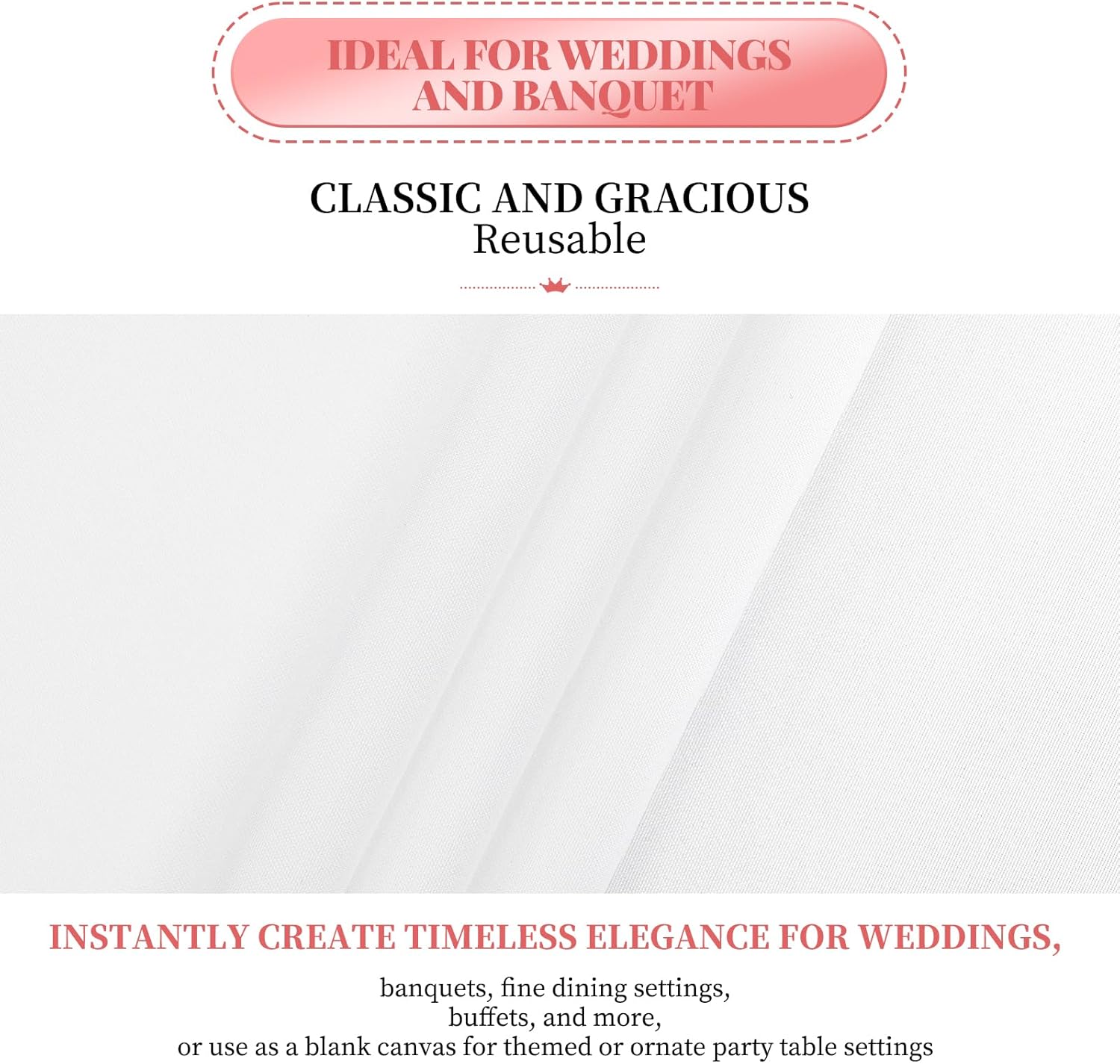 • 【Premium Tablecloth Fabrics】You can get 12 pieces white tablecloth, our tablecloth is made of soft 180 GSM 100% premium polyester fabric that resists wrinkling for an always crisp, polished look. These materials are as skin-friendly as they are environmentally friendly. Protect and decorate your tables.