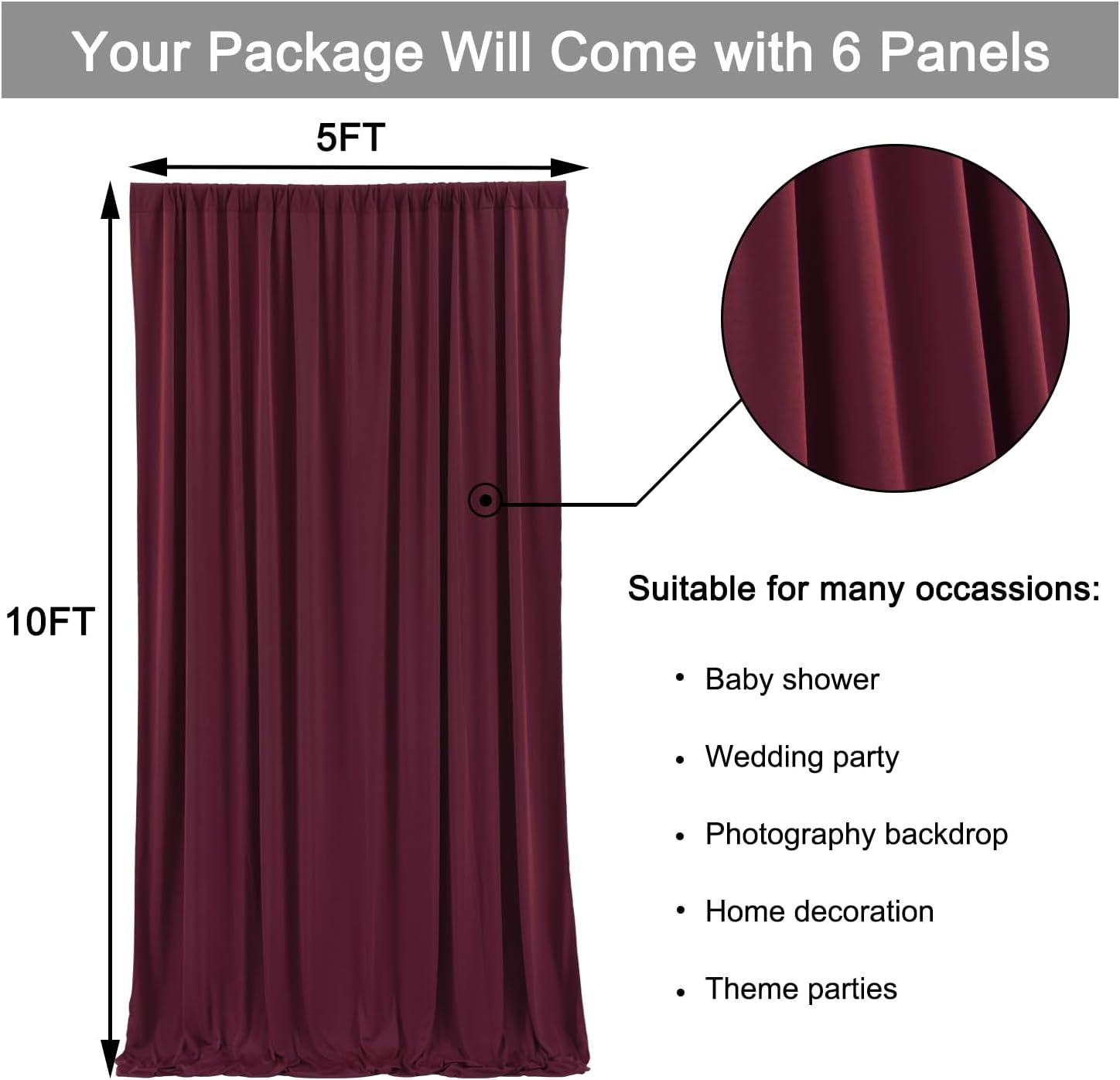 • Photography Backdrop Curtain Panels: Your package will come with 6 panels maroon photography backdrop drapes. Each background panels measures 5ft width and 10ft height.Entire backdrop curtain measures 30ft x 10ft.