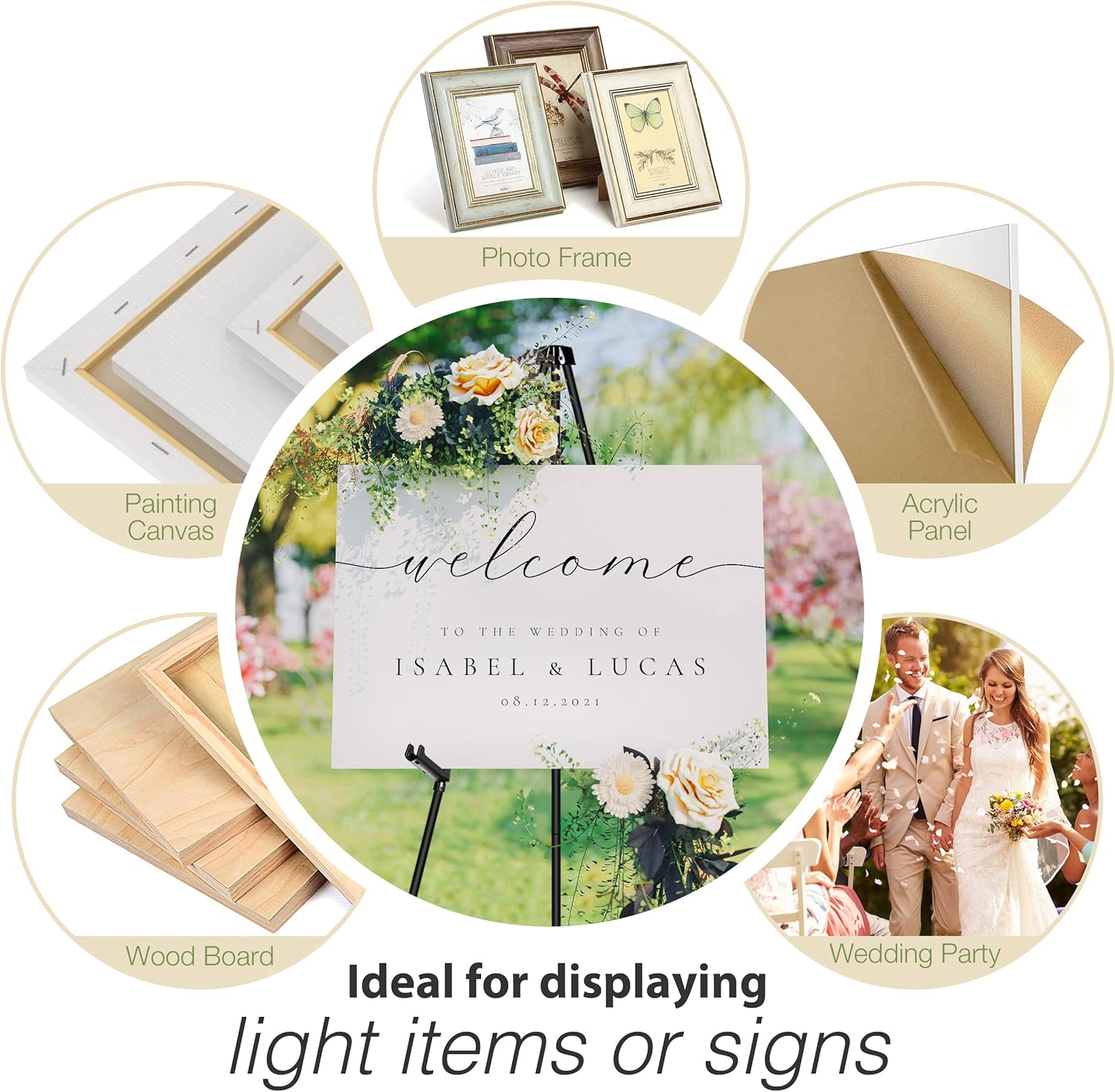 • ✔【Widely Compatible Easel】The display easel is made of black steel metal and can hold up to 8 lbs and is sturdy and durable. Suitable for displaying light items such as canvas, foam board, photo frame, wreath, wood board, acrylic panel, etc.