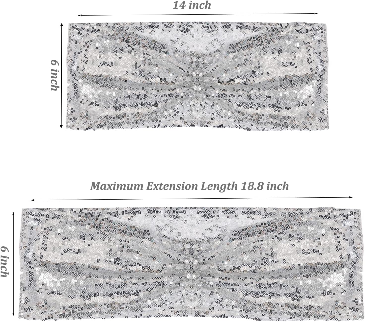 • Sequin chair sashes measures 6''x14'', stretches to fit the width of the back: 13.5 to 18.8 inches.Each pack of 100 chair sashes.