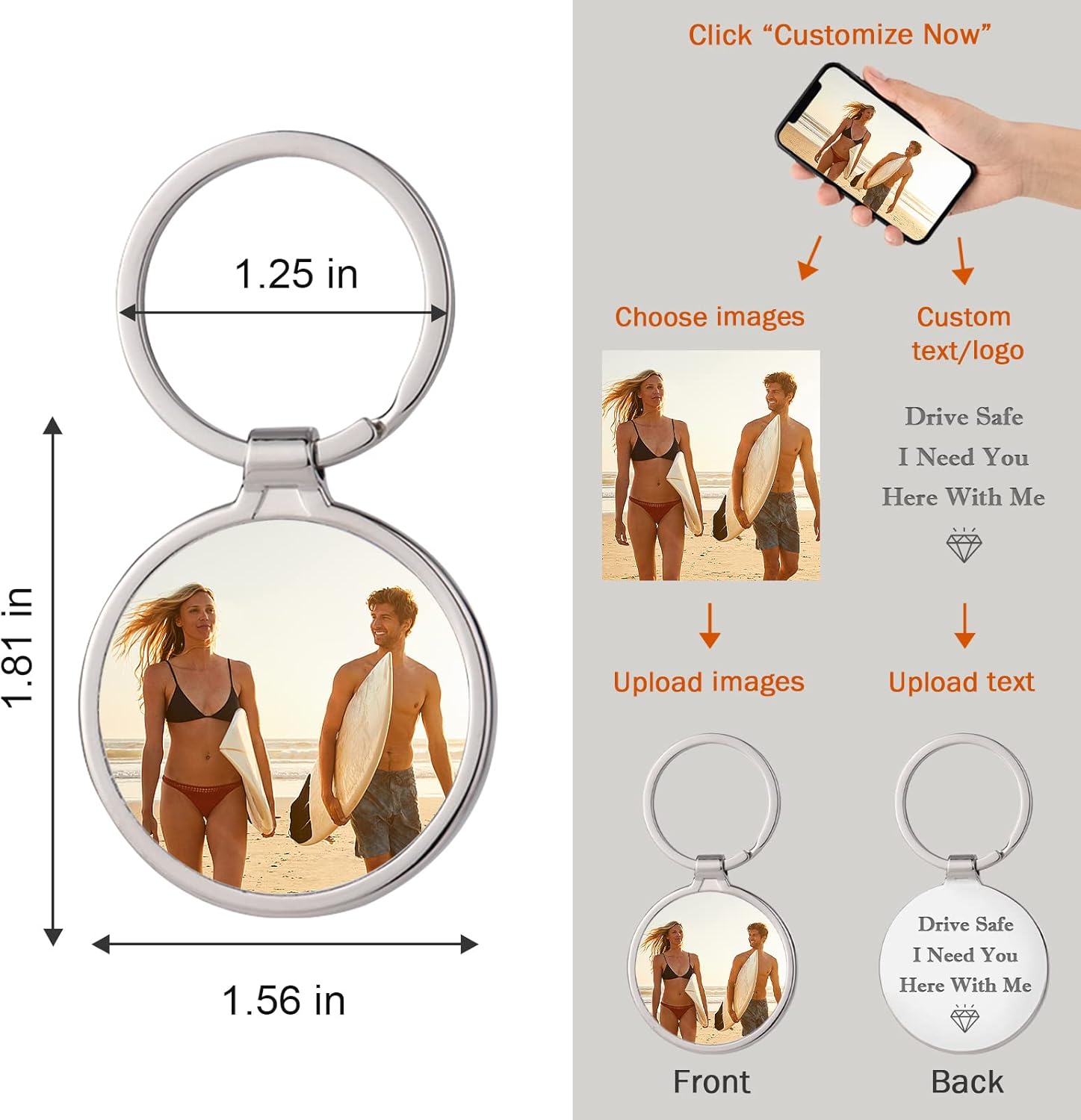 • 【Double Sided Custom Keychain】: Click "Customize Now" to start your own personalized keychain design. Upload your favorite HD pictures and customized text, and finally select icons to add. Tip: HD pictures will make the effect better!