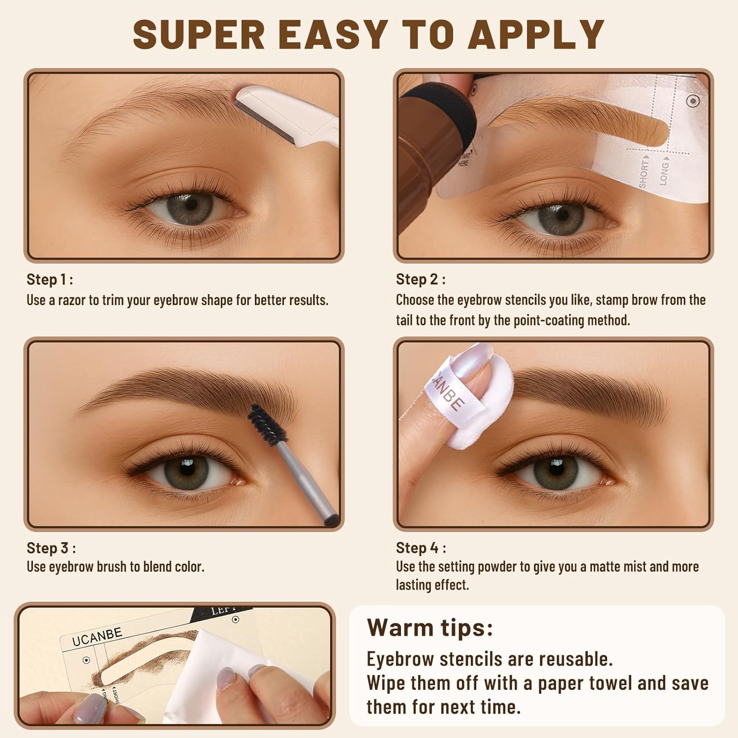 • 25PCS Eyebrow Stamp Stencil Kit: Includes 1 dual-color eyebrow stamp pomade, 20 reusable eyebrow stencils(10 pairs), 1 finising powder, 1 double-ended brush, 1 eyebrow razor and 1 zipper pouch for on the go. UCANBE eye brow stamping kit is designed for time-saving and ease of use, everyone can instantly create natural and attractive brows in seconds.