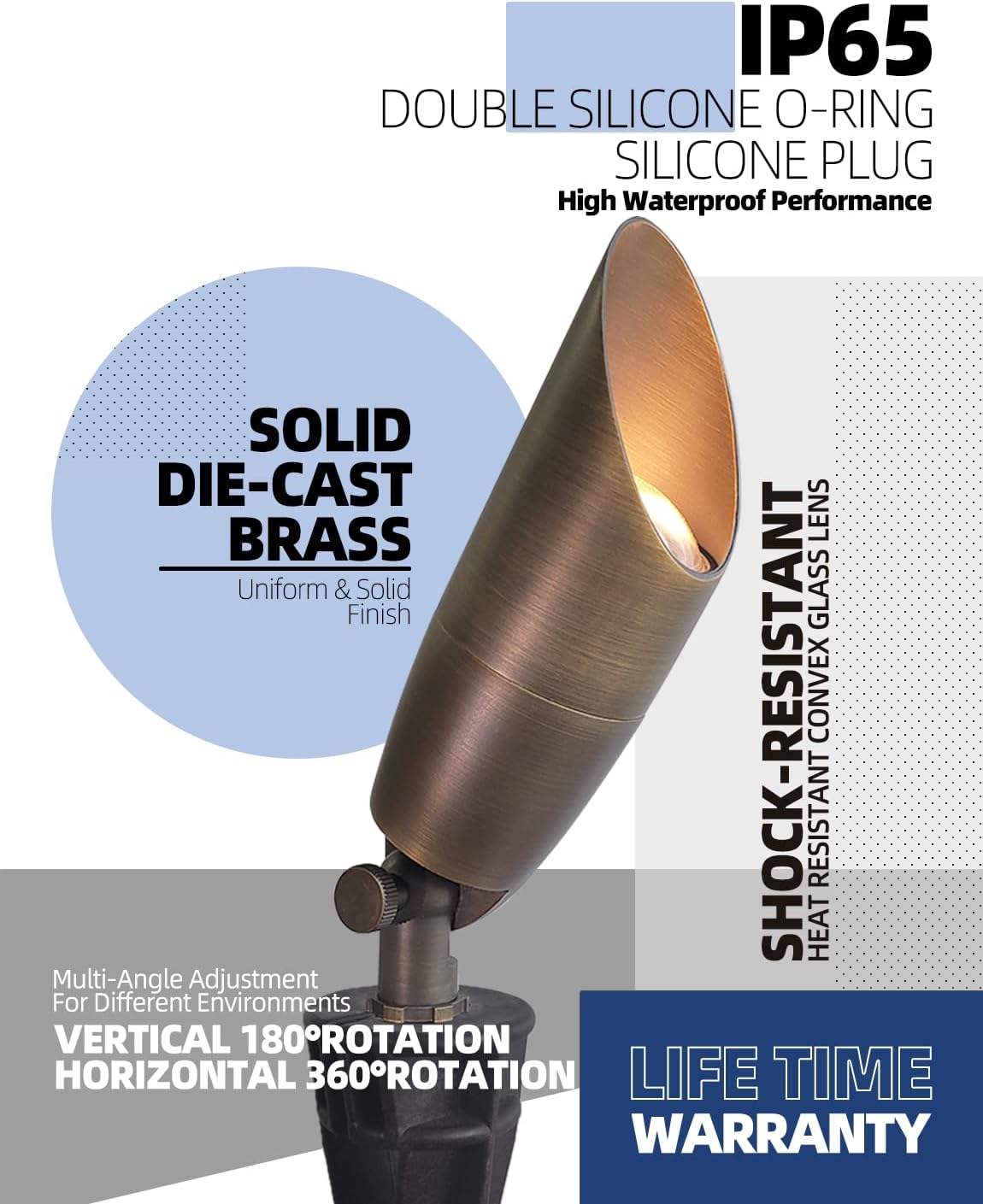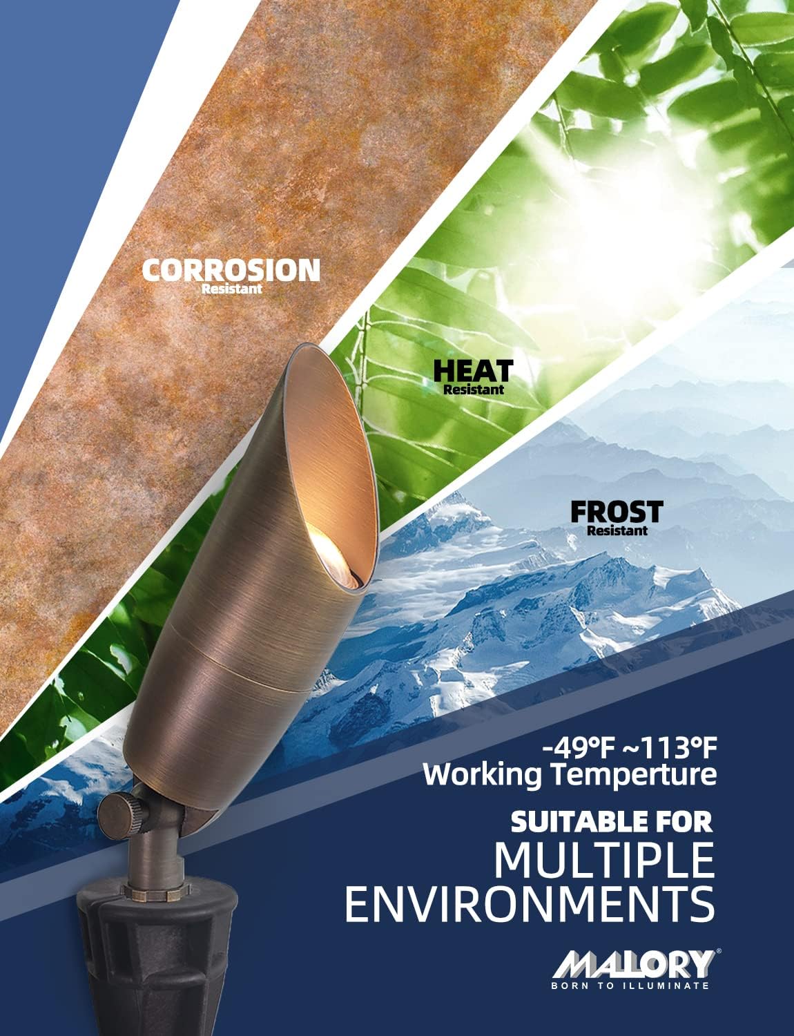 • BRASS LIGHT FIXTURE:MALORY landscape spotlight is constructed of die-cast brass for durability and beauty.Brass spot light doesn't corrode,more durable and reliable than aluminum and plastic fixtures,ideal for any uplighting application.Simple design structure for the light fixture make it looks beautiful yet unobtrusive in any landscape,suitable for decorating most houses and yards.