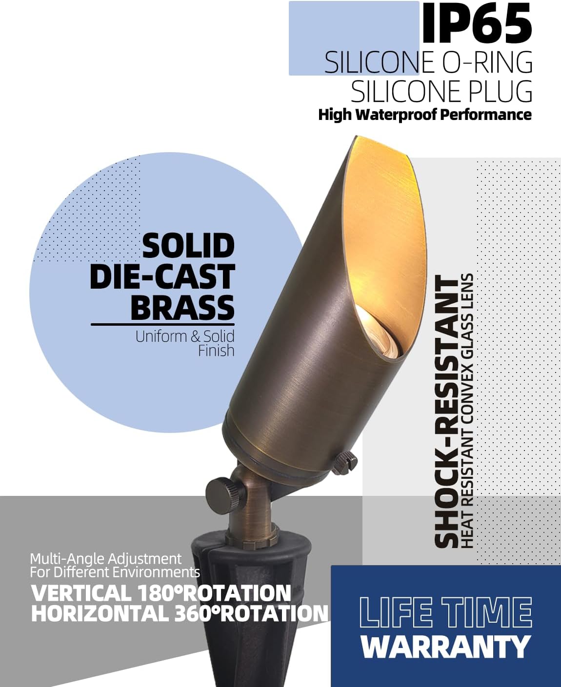 • WIDELY USED:The shroud for this landscape lights spotlight is adjustable and extendable.Features a 180°vertical rotation heavy duty adjustable knuckle and 360°horizontal rotation with the stake, you can light to any angle you want, even if you don't move the position. CRI 85+ low voltage garden patio spot up light bring out the natural color of objects, suitable for garden, yard, tree, house exterior, lawn and shrub.