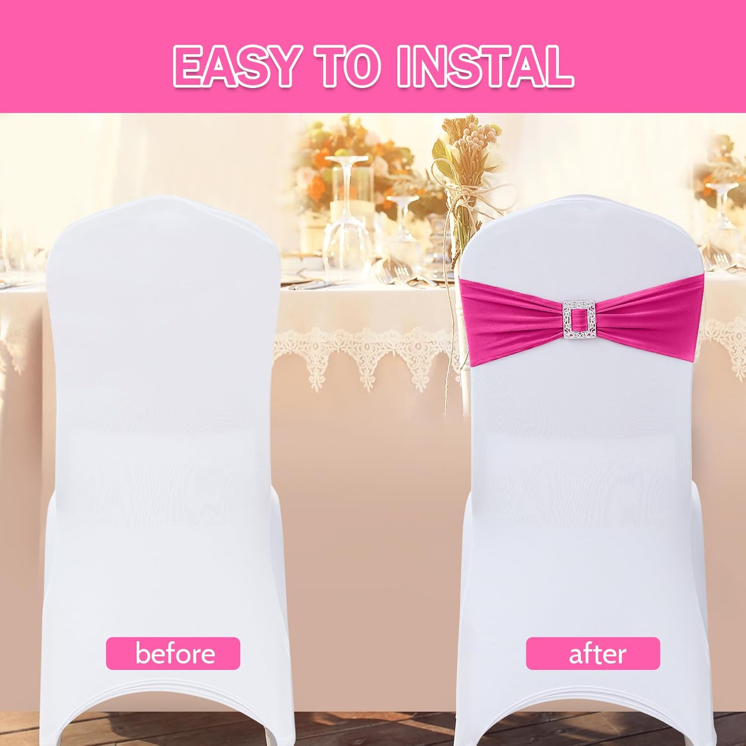 • Easy to Use:These stretch sashes for chairs are easy to wear and take off, no need to tie a bow, you just need to stretch over the chair cover.