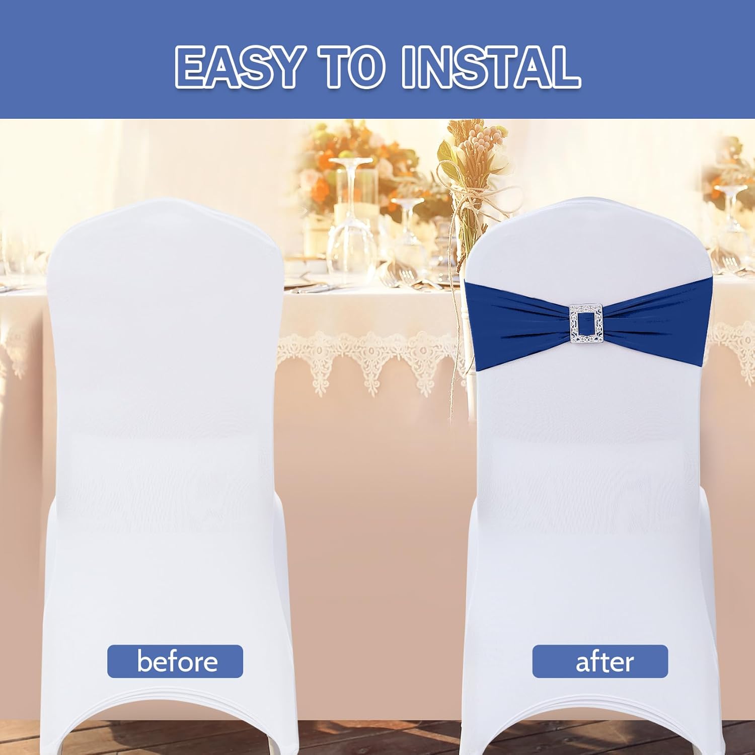 • Easy to Use:These stretch sashes for chairs are easy to wear and take off, no need to tie a bow, you just need to stretch over the chair cover.
