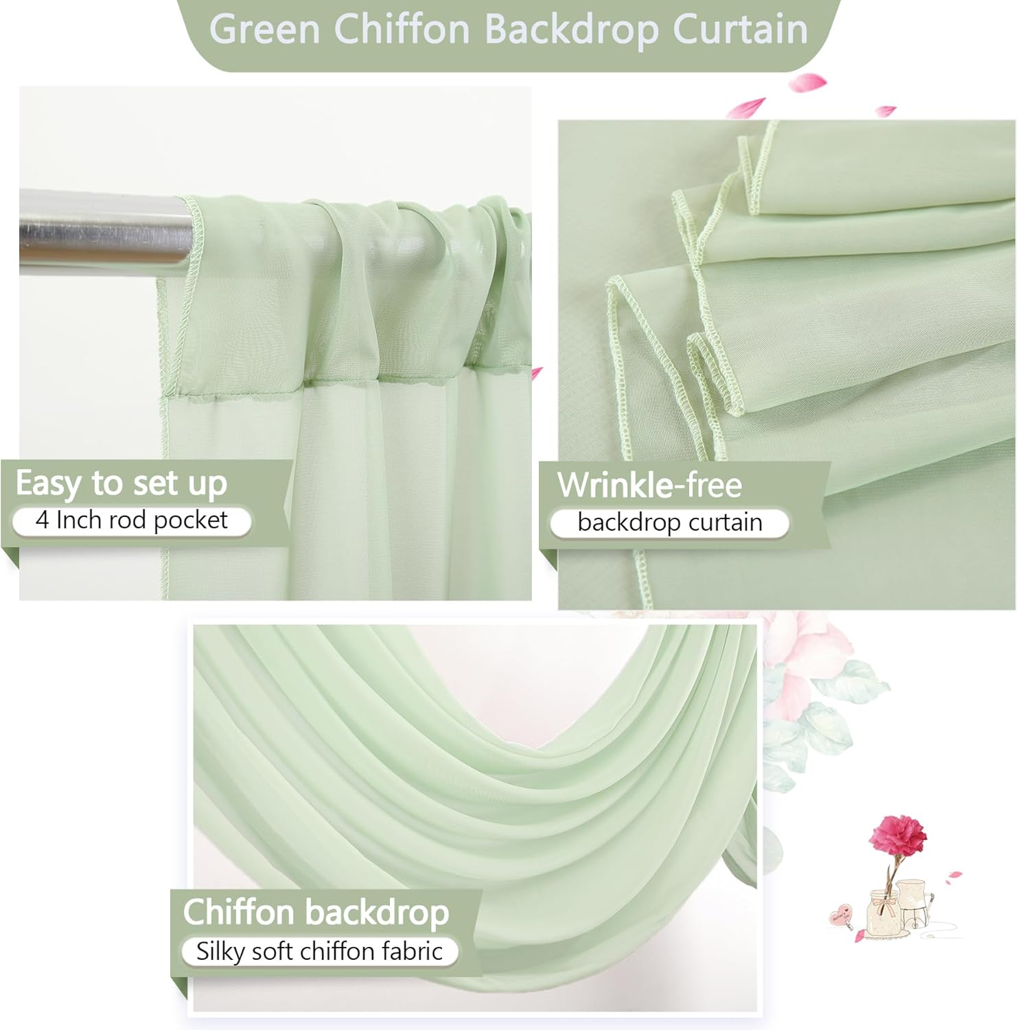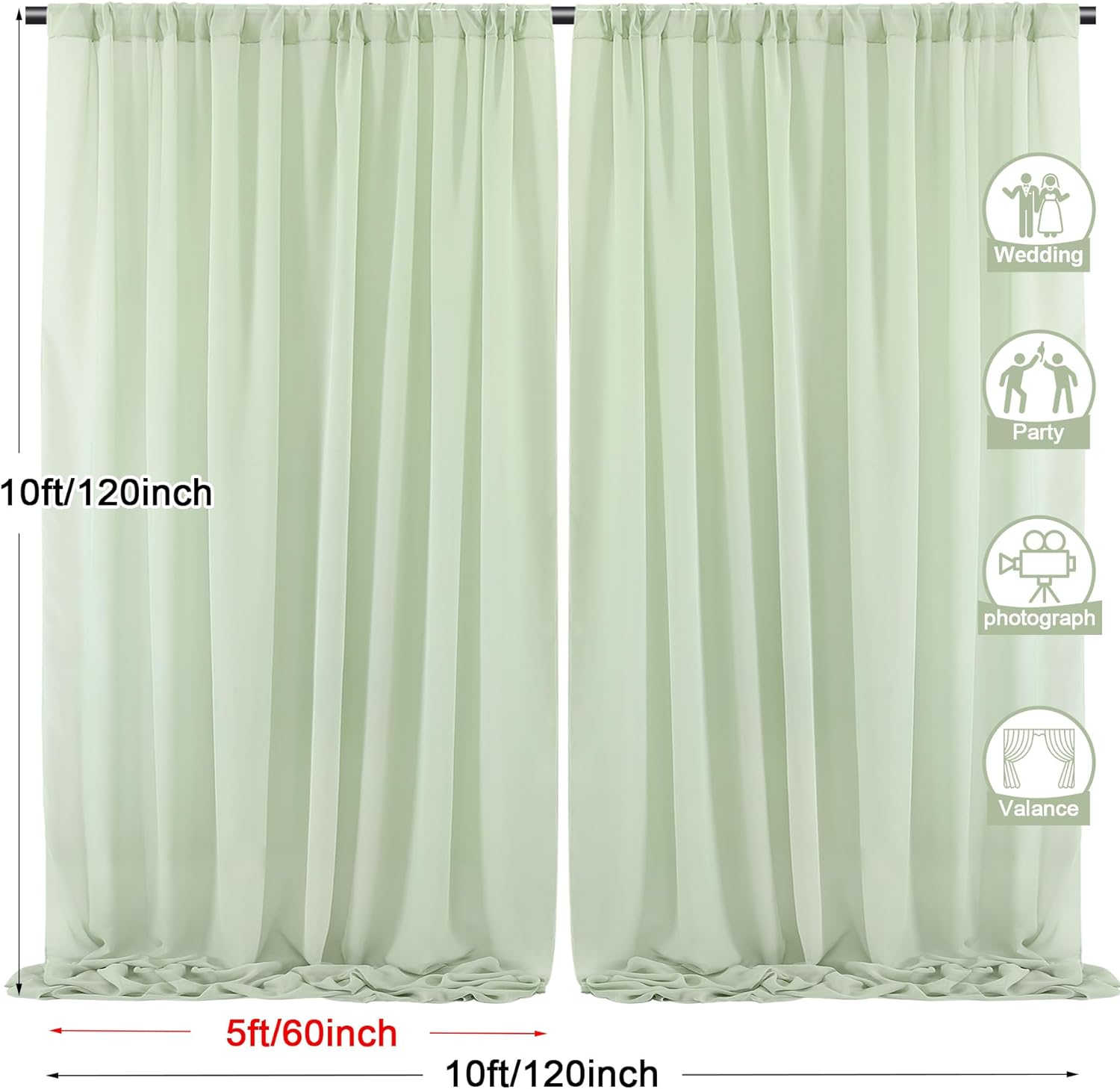 • 2 Panels Backdrop Drapes: Come with 2 panels Sage Green chiffon backdrop curtains,each panels size is 5ft width and 10ft height. Combined, entire backdrop curtains is 10ft*10ft. Please note: Not including the background stand