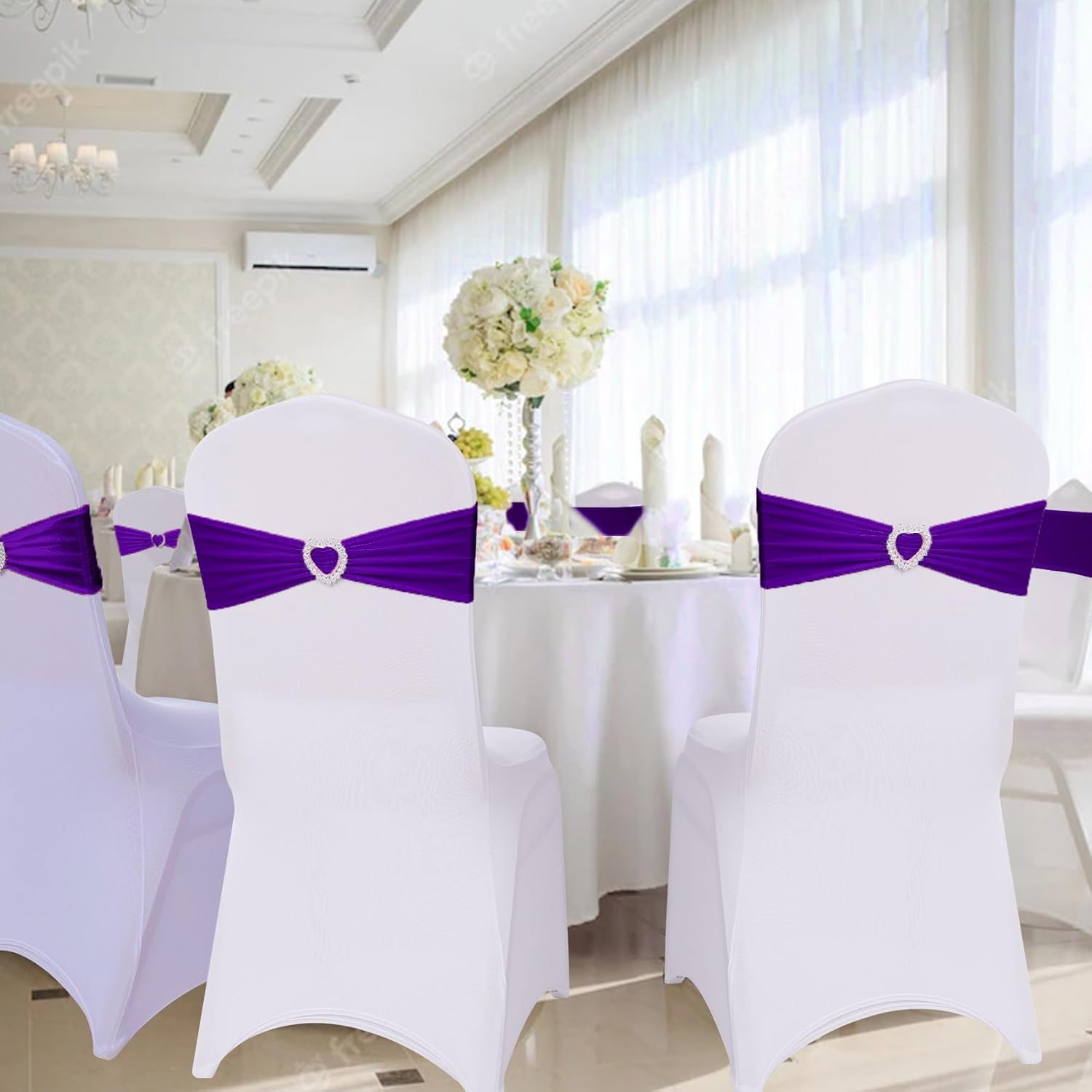 • MATERIAL:Sash(90% Polyester & 10% Spandex ), Buckle(100% Plastic).The white chair covers are not included.
