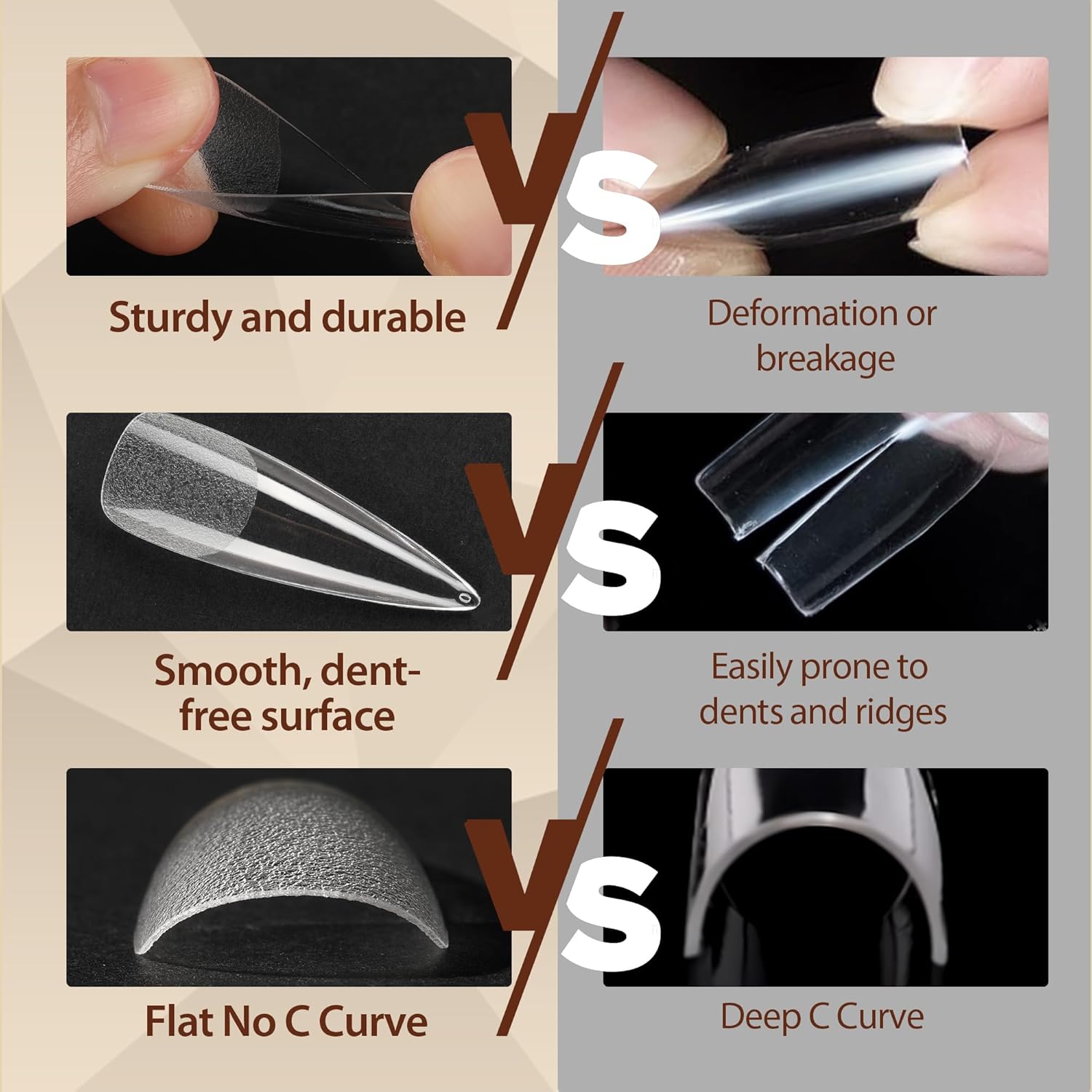 • 【Natural Fit Effect】 - The soft long fake nails feature a “ Thin back edge, thick front edge”. The thinner back edge can make the full acrylic nails fit your nails better. The clear surface of gel nail tips makes the color more visible. The thickened front edge makes it not easy to break or bend, having a longer lifespan. Just like your natural nails!