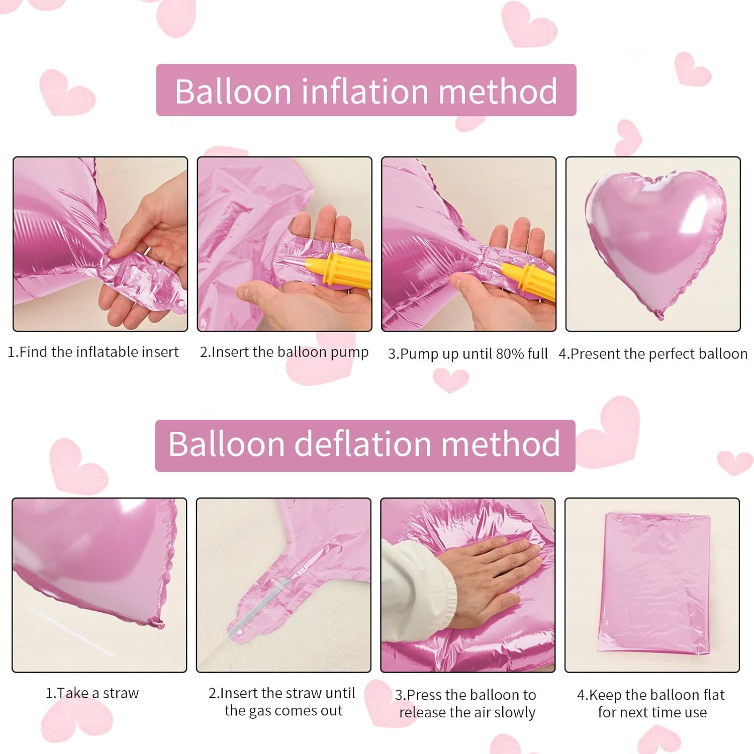 • πŸ’– Easy To Use: These pink heart shaped birthday balloons can be filled with air or helium (inflate to 85%-90%, to prevent it from becoming too large and exploding). The valve seals automatically when inflated, and the gas inside can be emptied with a plastic straw, making them reusable. The set also comes with 10 meters of ribbon, making it easy to decorate your room for your children and spouse.