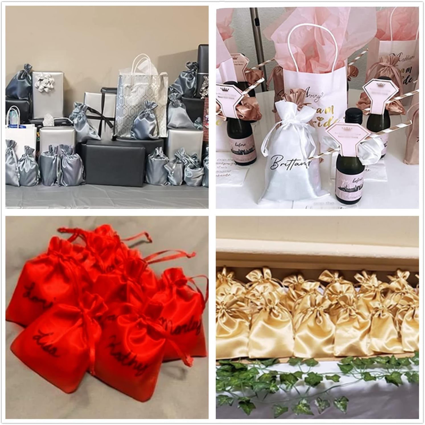 • ๐Ÿ’– Multipurpose: These silk satin gift bags are great for any number of occasions, Perfect to use as baby shower gift bags, wedding favor bags, Valentine's Day gift bags, candy bags,Christmas gift bags, soap bags, bath bomb bags, jewelry bags even on a ordinary special day trying to make your gift bag looks amazing. Also you can use them as dice bags, tarot bags or tarot pouches.