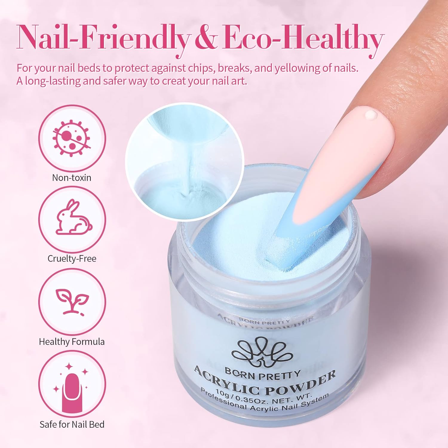 • ❤HEALTHY & NO NEEDED NAIL LAMP: BORN PRETTY acrylic powder nail kit is made of advanced healthy formula, no animal testing, 11-free, will not cause any discomfort to your precious nails, and is friendly to nails. BORN PRETTY acrylic powder colors system no need nail lamp.