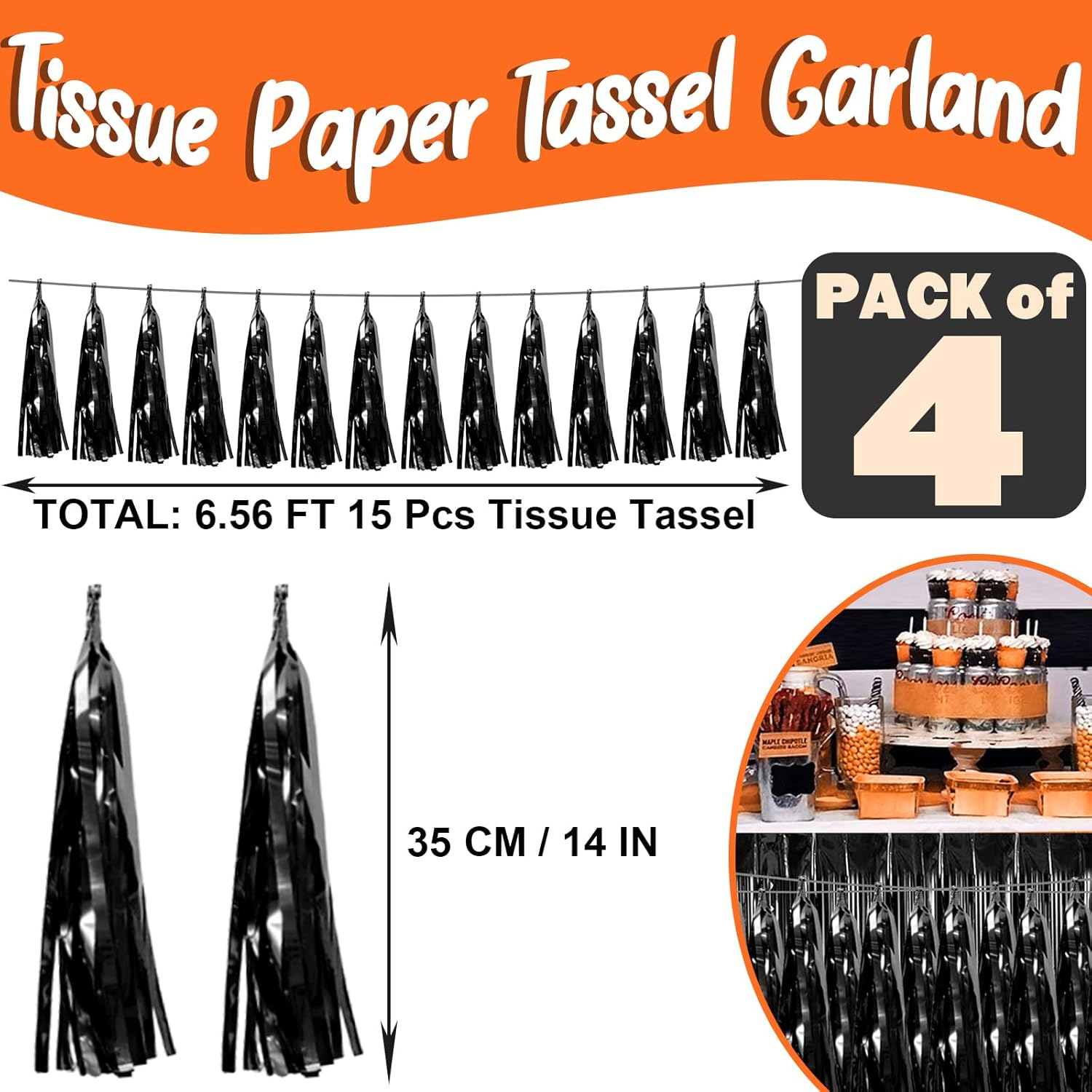 4P Black Foil Fringe Metallic Tassel Streamers Banner Tassel Garland for Parade Floats, Bachelorette, Wedding, Birthday, Halloween, Christmas, Bridal/Baby Shower Party Decorations
