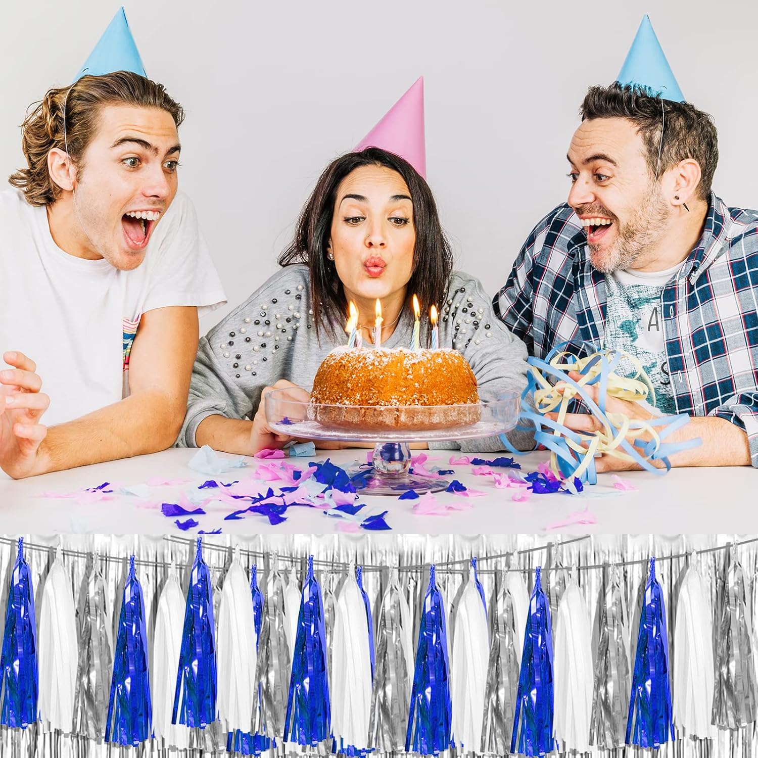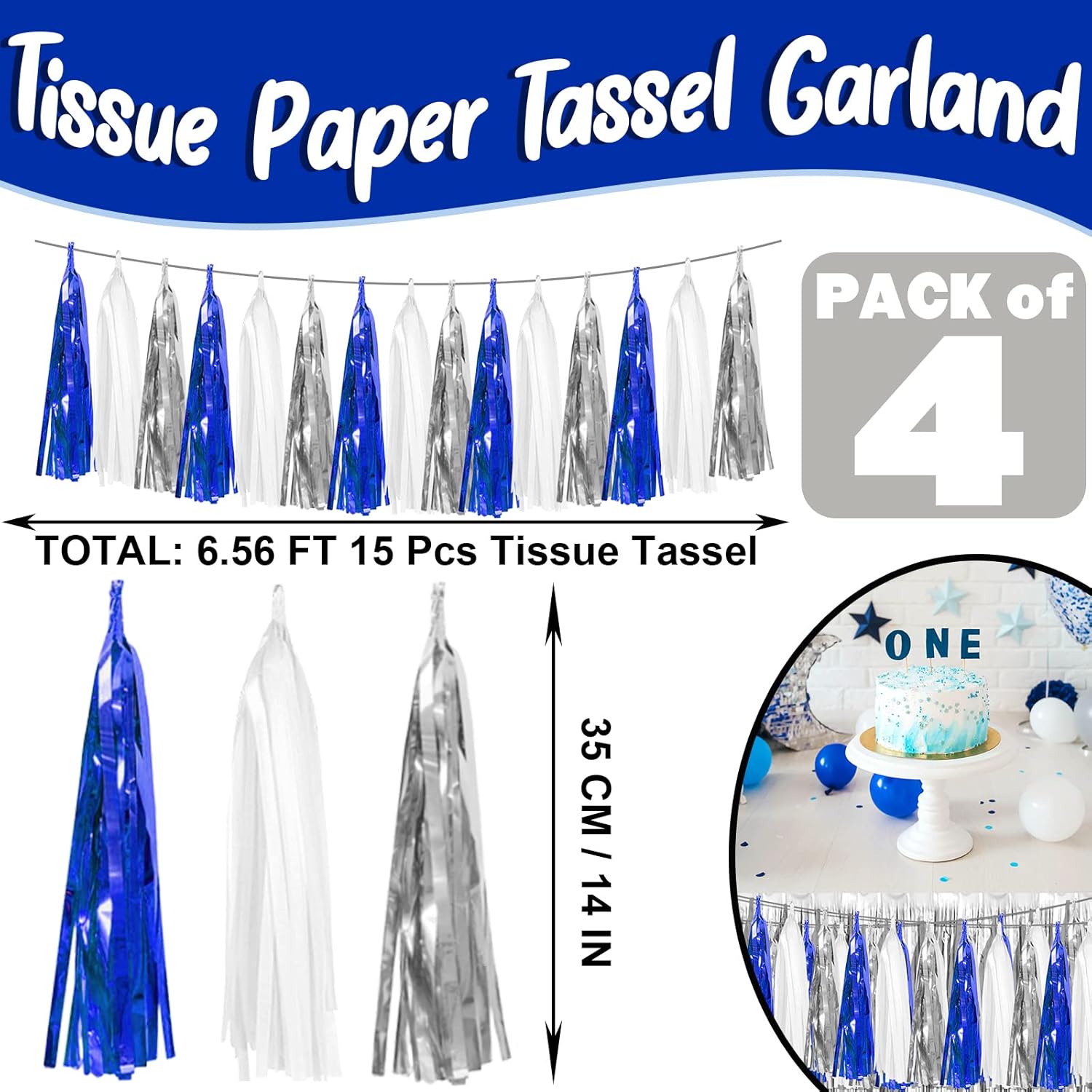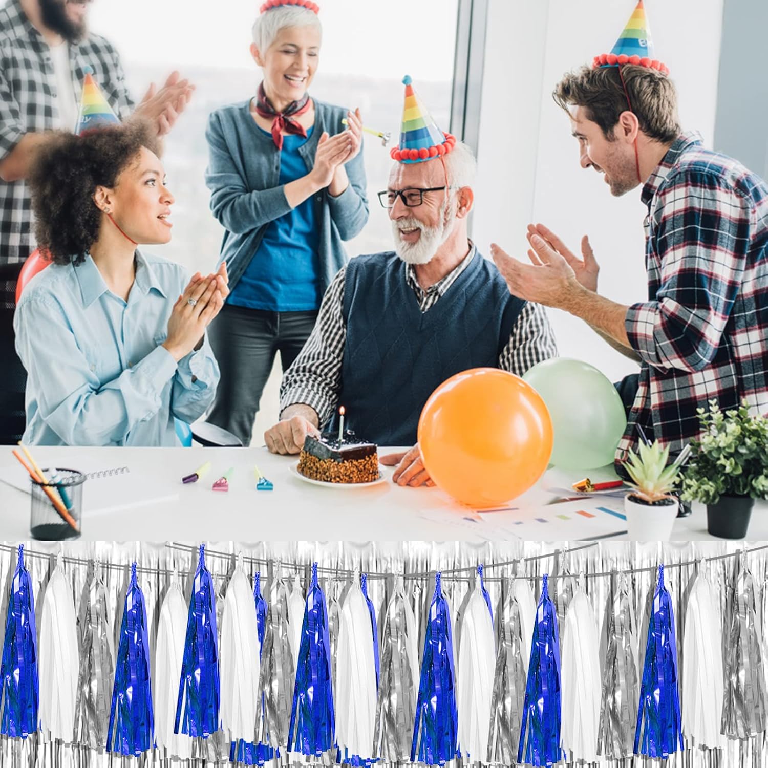 • 【Navy Blue White Silver Party Supplies Set】: The total length of the navy blue white silver birthday tassels banner is 39.3 feet, divided into 4 strips, each 9.8 feet long. Each banner contains 15 tassels, and each tassel measures 14 inches, for birthday decorations many occasions, and so on