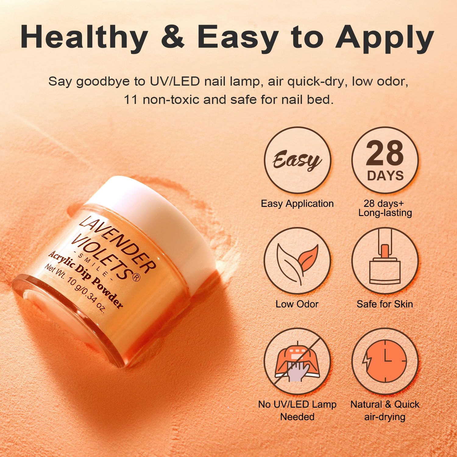 • Great Choice for Acrylic Dip Nail Art: Be fashionable and trendy with Lavender Violets Dip Nails Powder Set, 16 stunning colors which includes pumpkin fall yellow orange gold red and brown, enable you to create more than 100 dips nail design.