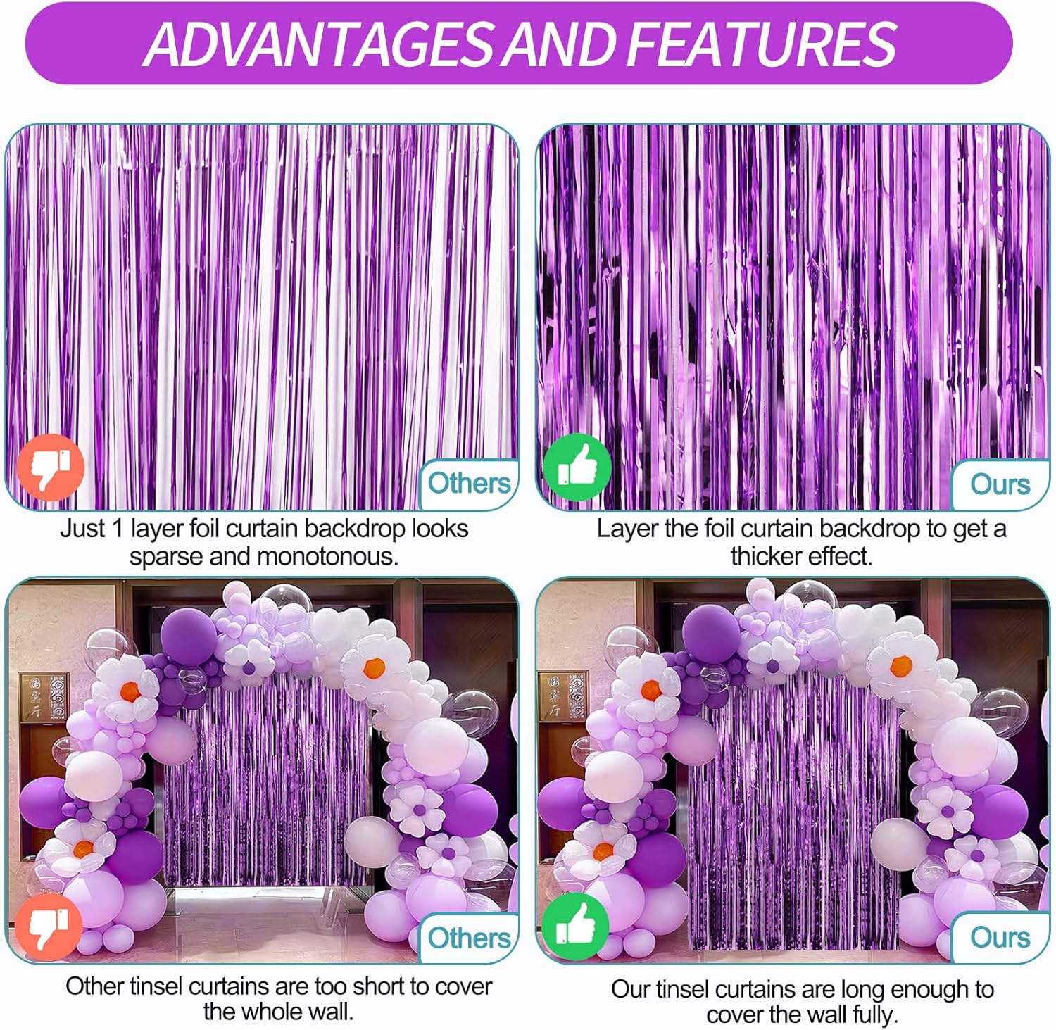 • Easy to Use - The foil curtain backdrop comes with double sided tape on the top, peel plastic strip off and it would be very easy to paste on smooth surfaces such as wall, window, table, door or anywhere you like. You can cut the foil curtain with scissors into the suitable Length, assemble the party streamers side by side to make the backdrop larger, or layer the backdrop curtains to get a thicker effect.