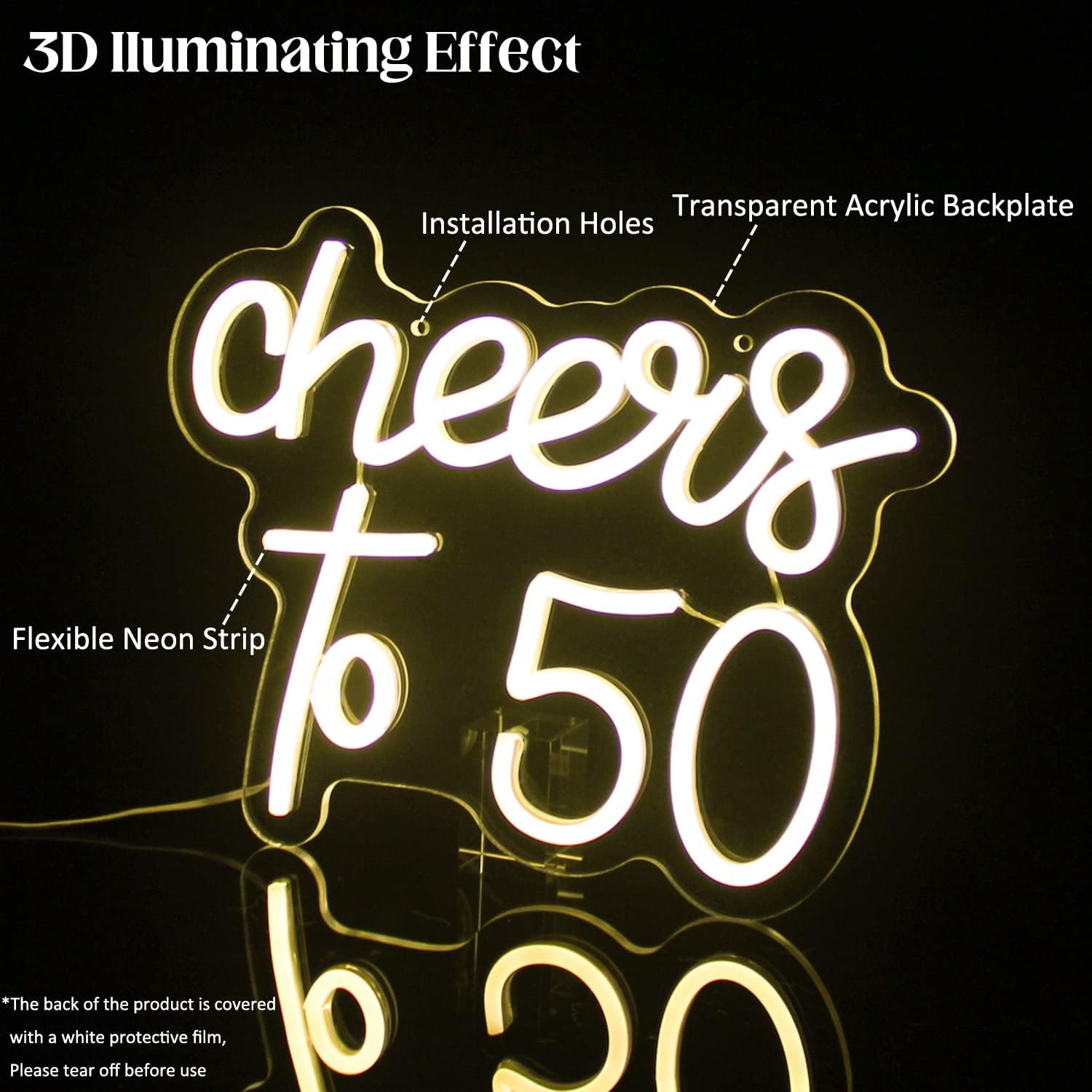 • Happy 50th Decor: Cheers to 50 years neon light up sign is perfect to make a great addition to the 50th anniversary theme or to happy 50th birthday decorations. It is also suitable as a gift for your lover or friend.