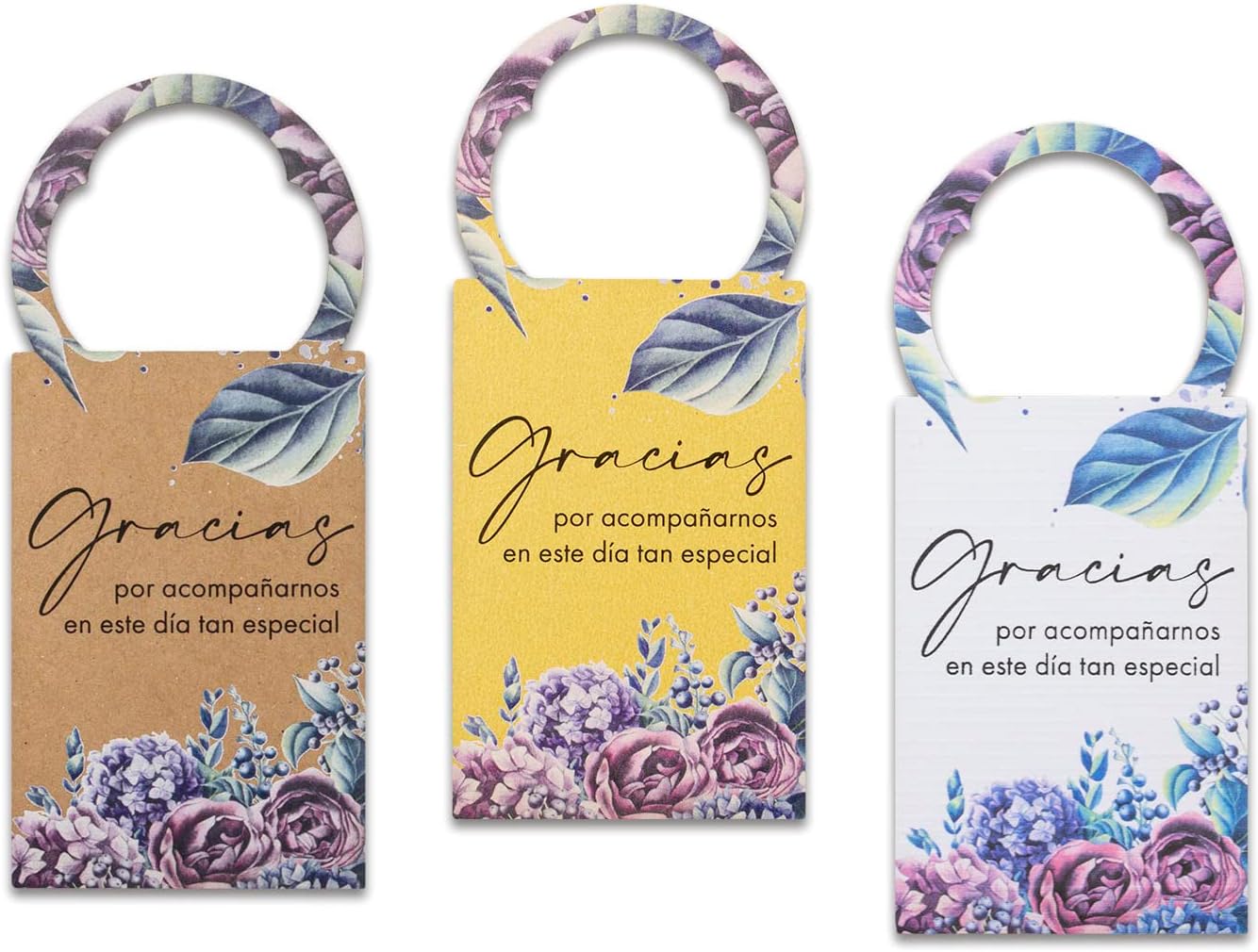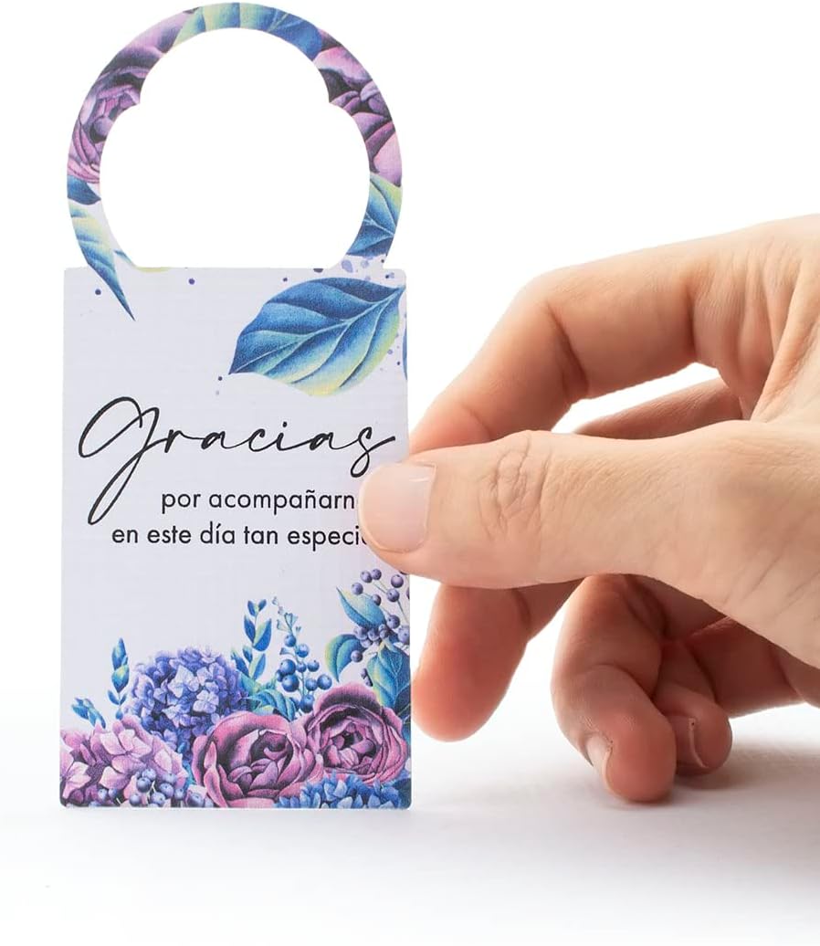 • The tags are made using 250GSM (170lbs) premium quality white card stock with linen texture. Each tag is printed with the wordings "Gracias por acompaΓ±arnos en este dΓ­a tan especial".