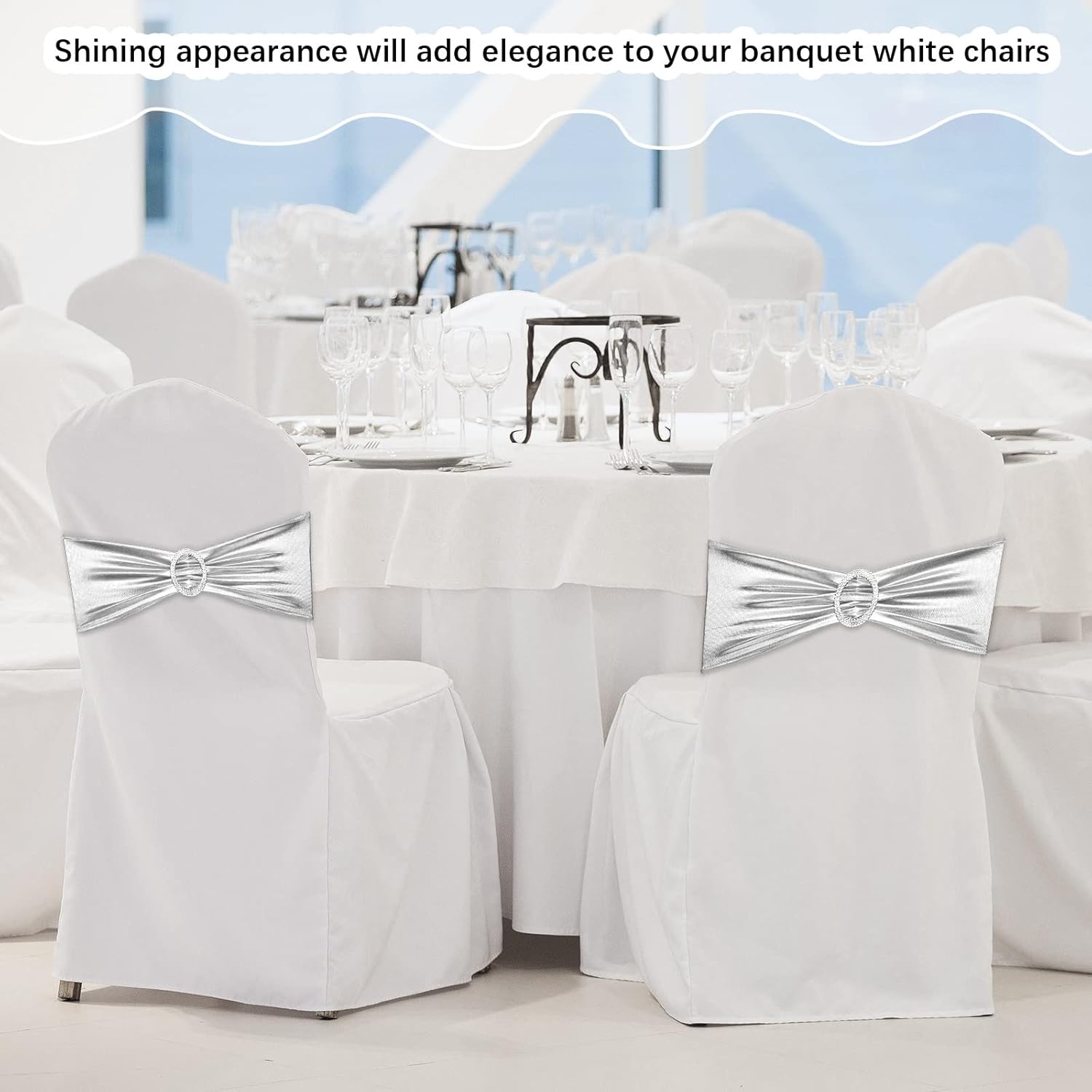 CHENGU 150 Pieces Spandex Stretch Chair Sashes Bows Elastic Chair Cover Bands Ties with Buckle Slider for Wedding Party Reception Events Universal Ceremony Banquet Decorations (Silver)
