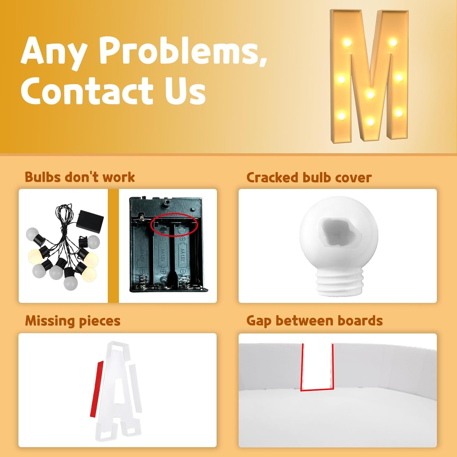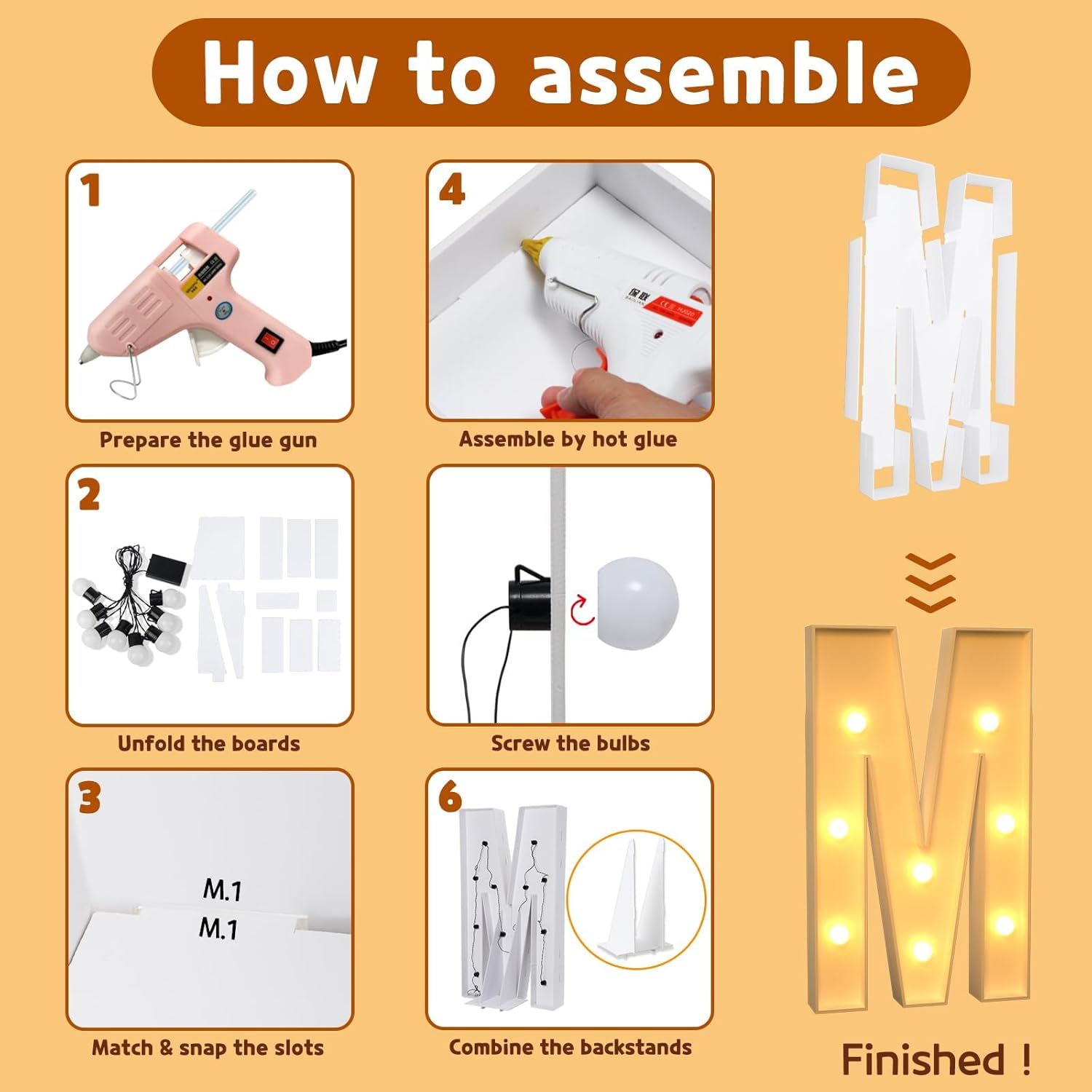 • Need to Assemble: 3 ft marquee letters are pre-cut frame with slots, 1) Match the slots on the board and put all boards together by hot glue; 2) Screw the bulbs on the board and install 3 AA batteries