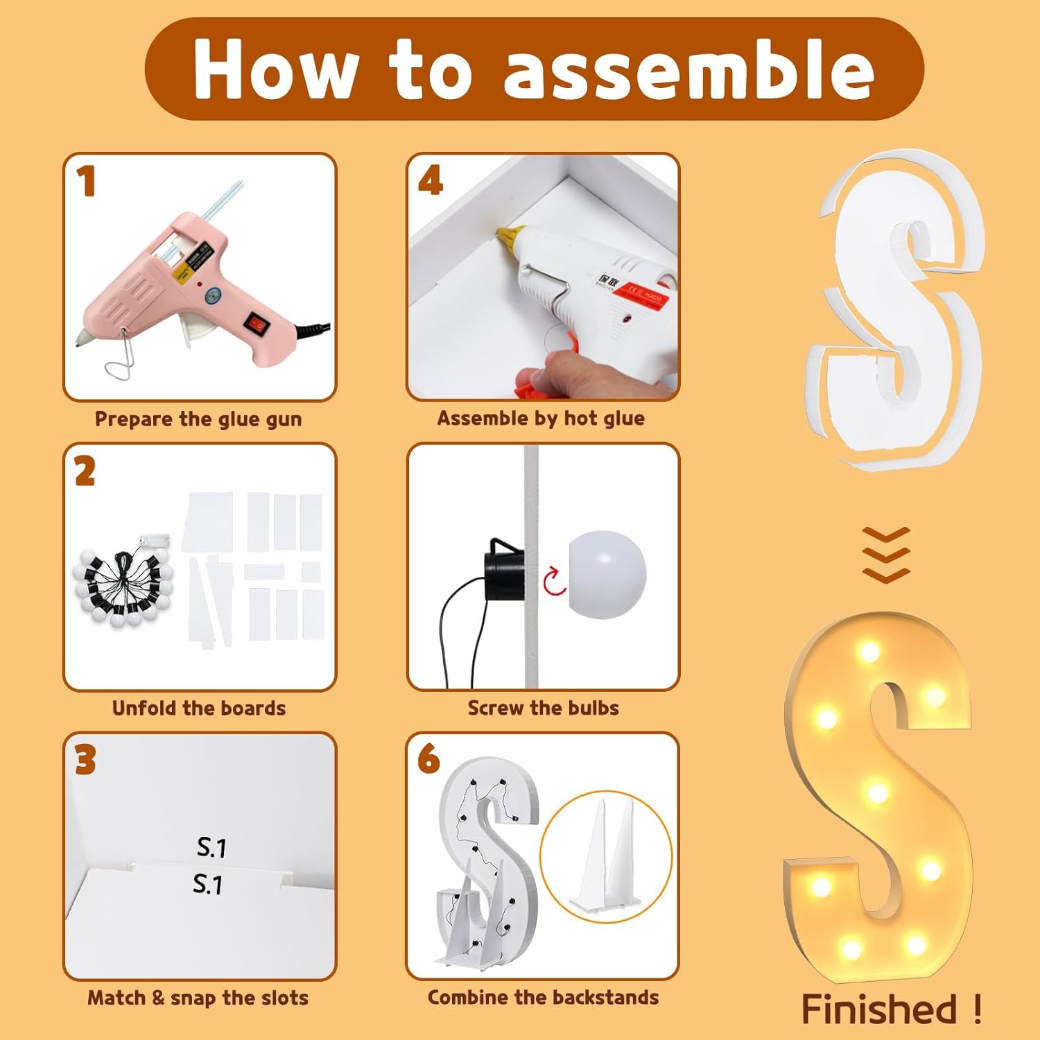 • Need to Assemble: 3 ft marquee letters are pre-cut frame with slots, 1) Match the slots on the board and put all boards together by hot glue; 2) Screw the bulbs on the board and install 3 AA batteries