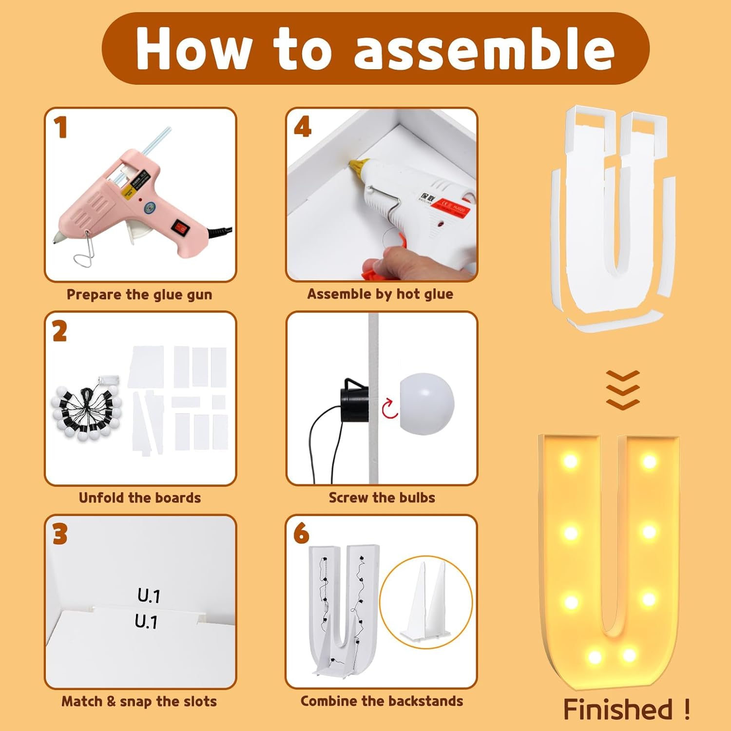 • Need to Assemble: 3 ft marquee letters are pre-cut frame with slots, 1) Match the slots on the board and put all boards together by hot glue; 2) Screw the bulbs on the board and install 3 AA batteries