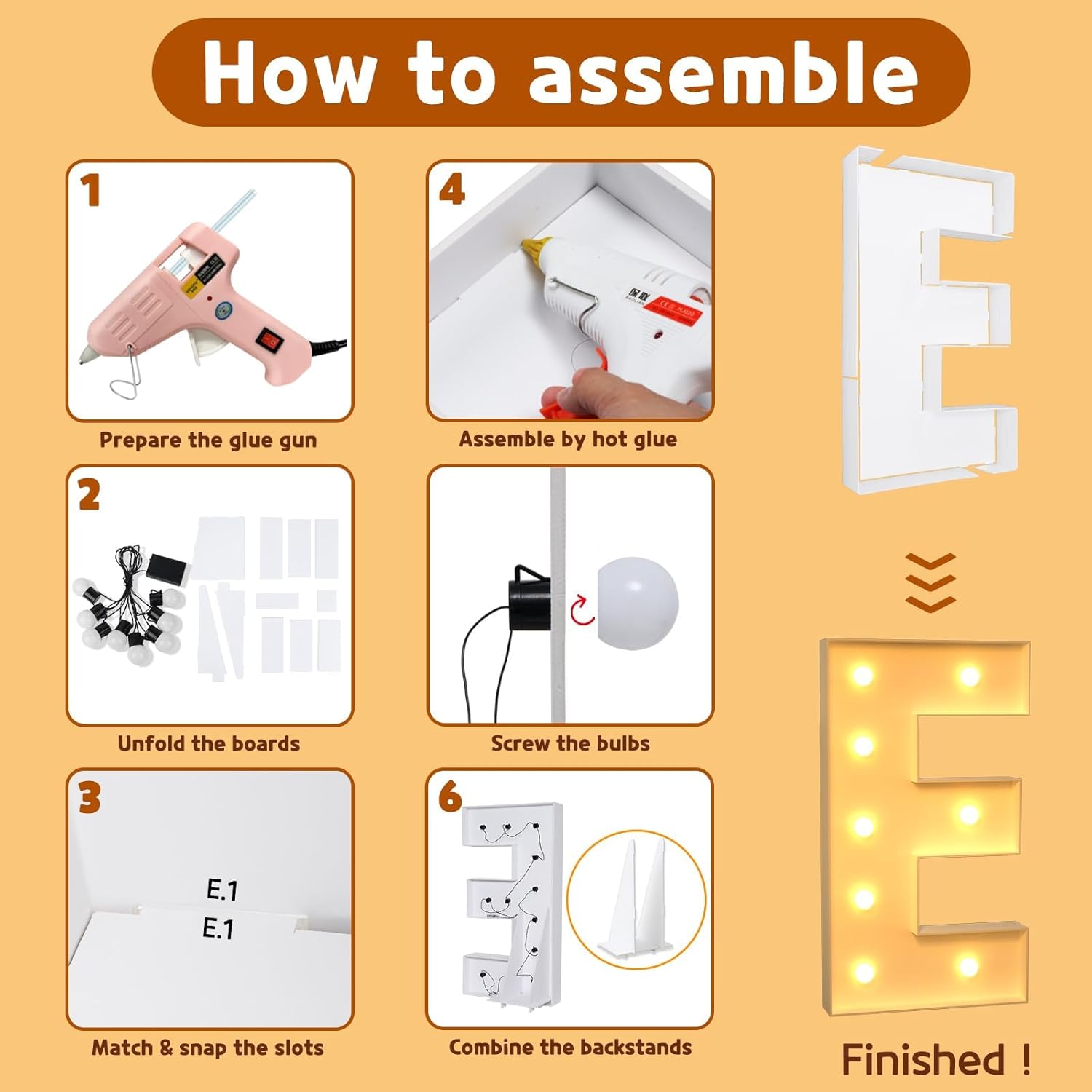 • Package Includes: A set of light up letters for party containing the pre-cut letter frames, a light string with several bulbs and assemble guiding manual. ( Noted: Glue gun and batteries are not included