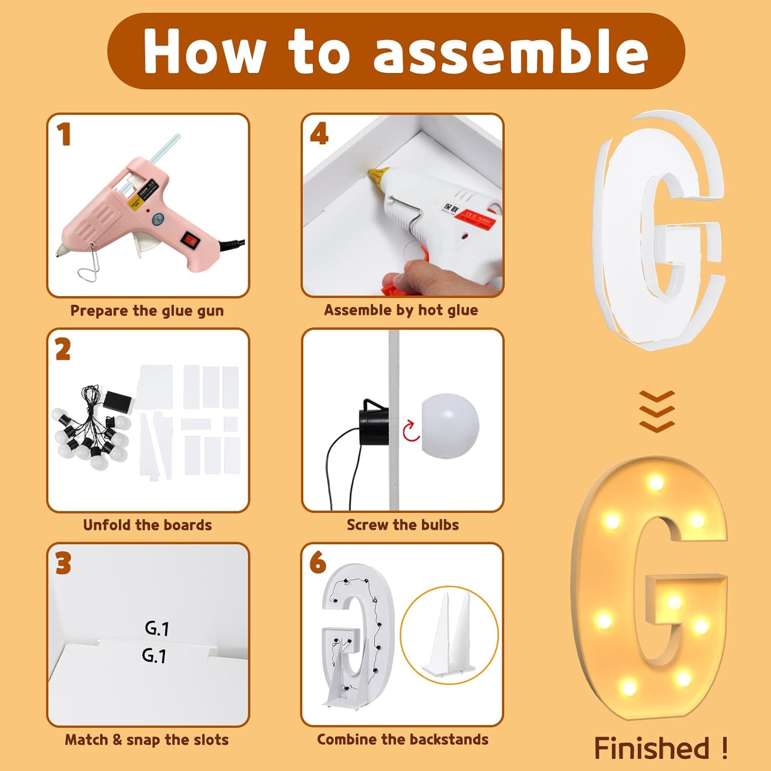 • Package Includes: A set of light up letters for party containing the pre-cut letter frames, a light string with several bulbs and assemble guiding manual. ( Noted: Glue gun and batteries are not included