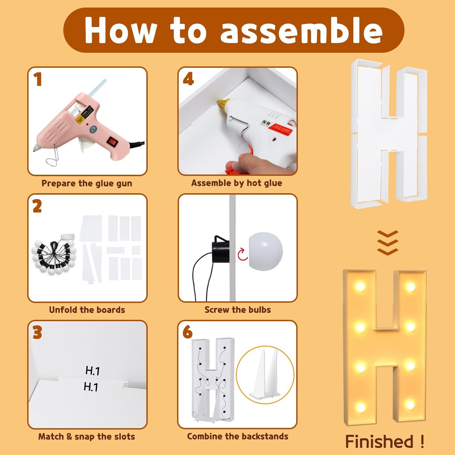 • Need to Assemble: 3 ft marquee letters are pre-cut frame with slots, 1) Match the slots on the board and put all boards together by hot glue; 2) Screw the bulbs on the board and install 3 AA batteries