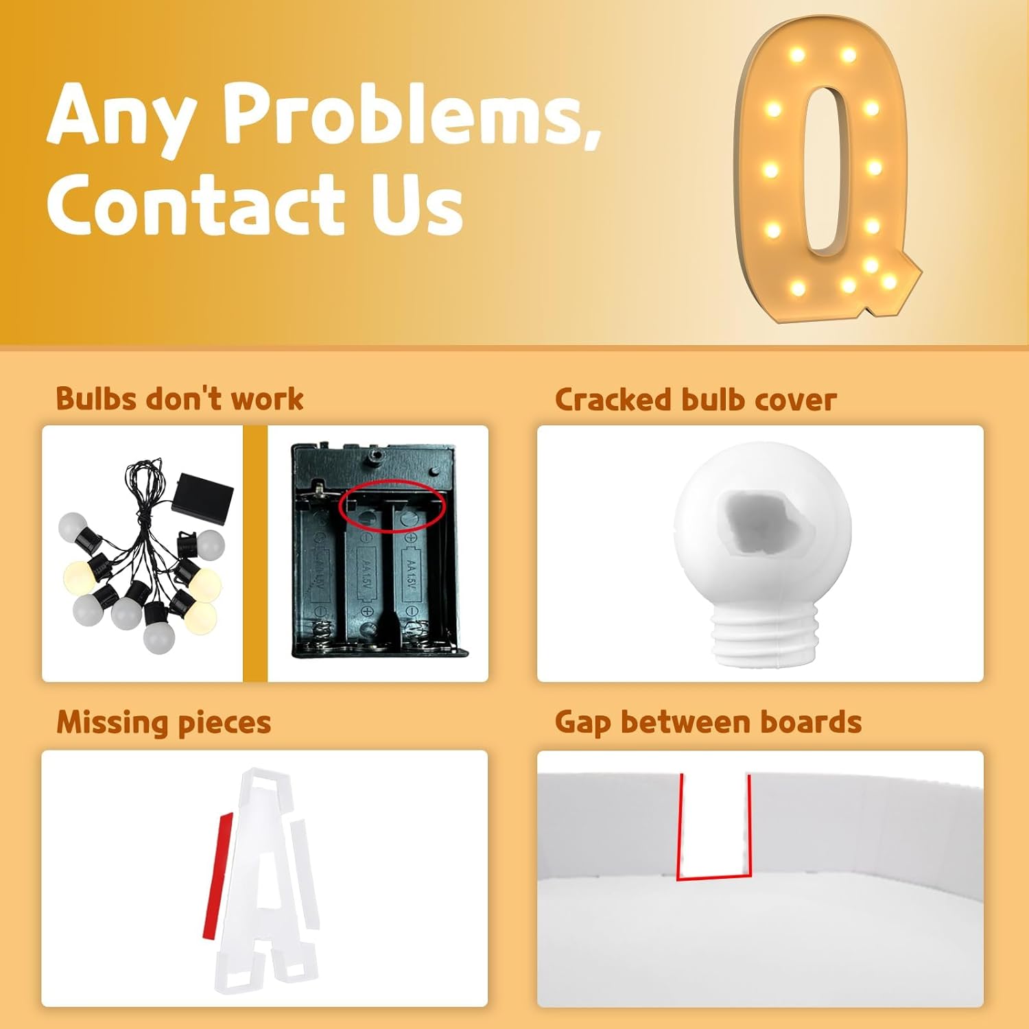 • Need to Assemble: 4 ft marquee letters are pre-cut frame with slots, 1) Match the slots on the board and put all boards together by hot glue; 2) Screw the bulbs on the board and install 3 AA batteries