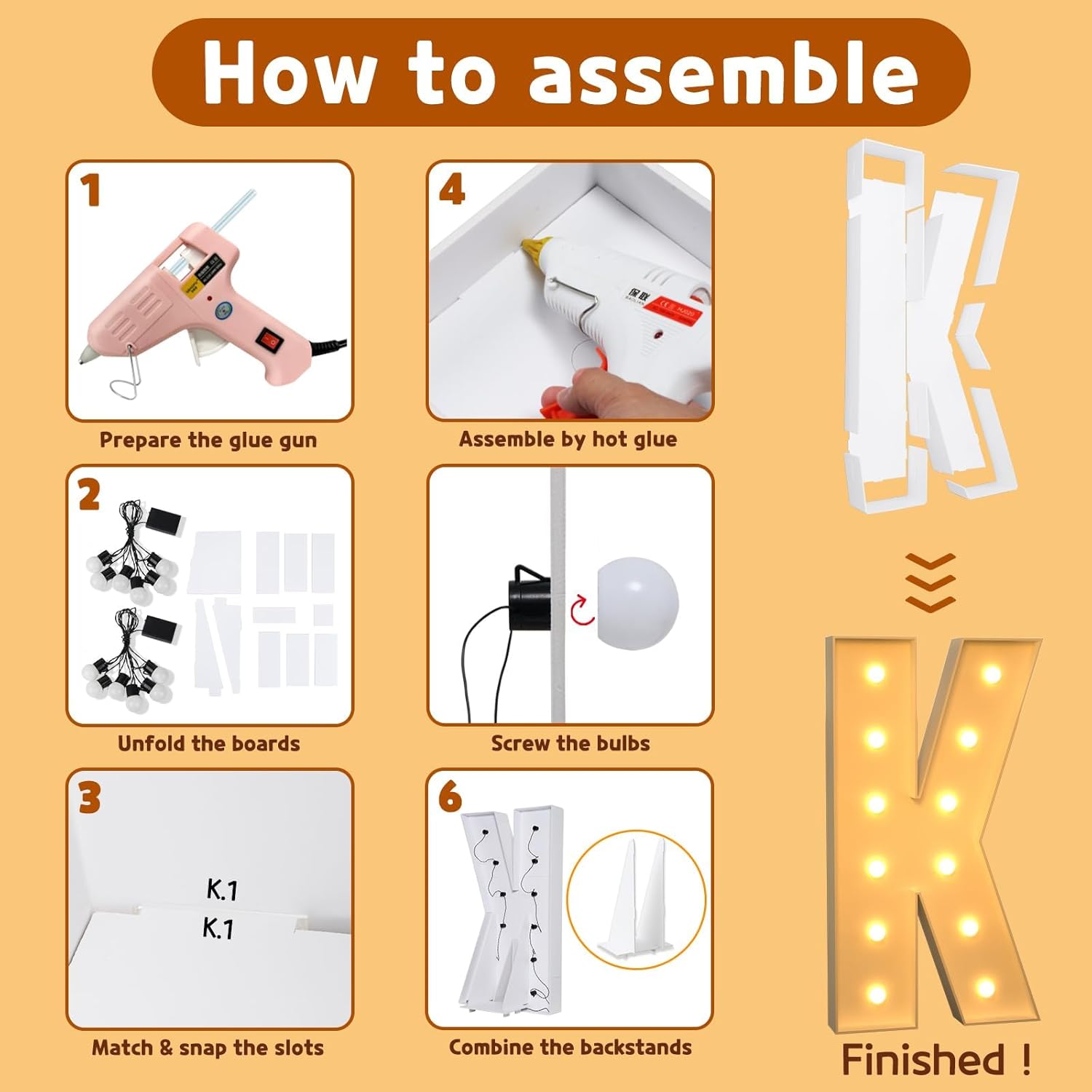 • Need to Assemble: 4 ft marquee letters are pre-cut frame with slots, 1) Match the slots on the board and put all boards together by hot glue; 2) Screw the bulbs on the board and install 3 AA batteries