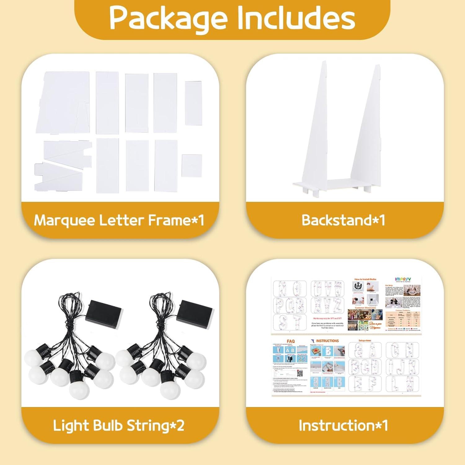 • Package Includes: A set of light up letters for party containing the pre-cut letter frames, a light string with several bulbs and the assemble instructions. ( Noted: Glue gun and batteries are not included