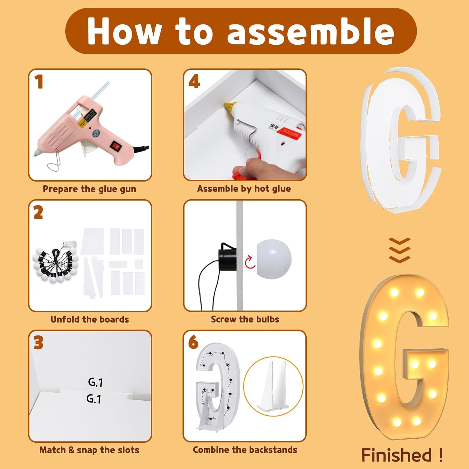 • Need to Assemble: 4 ft marquee letters are pre-cut frame with slots, 1) Match the slots on the board and put all boards together by hot glue; 2) Screw the bulbs on the board and install 3 AA batteries