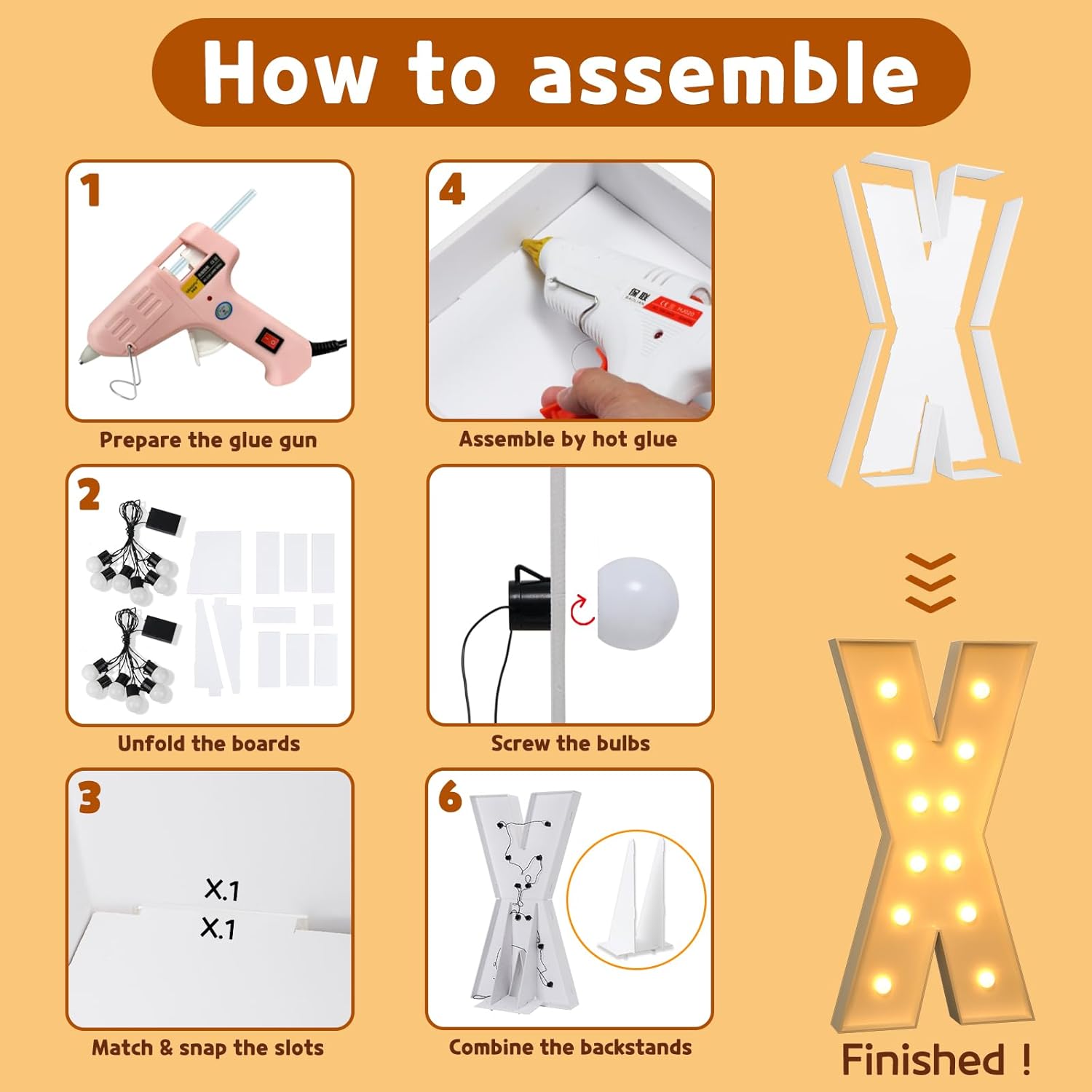 • Need to Assemble: 4 ft marquee letters are pre-cut frame with slots, 1) Match the slots on the board and put all boards together by hot glue; 2) Screw the bulbs on the board and install 3 AA batteries