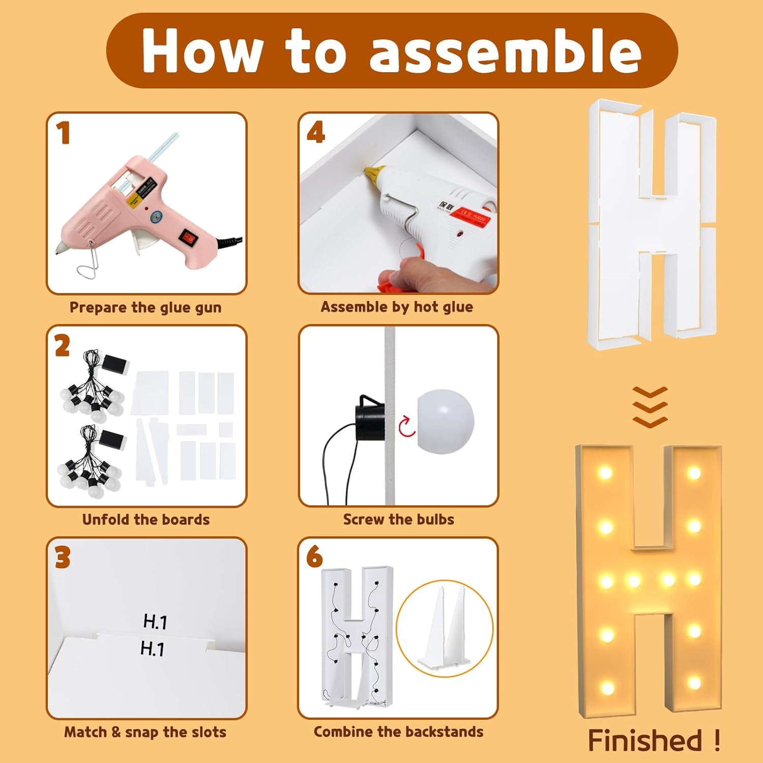 • Need to Assemble: 4 ft marquee letters are pre-cut frame with slots, 1) Match the slots on the board and put all boards together by hot glue; 2) Screw the bulbs on the board and install 3 AA batteries
