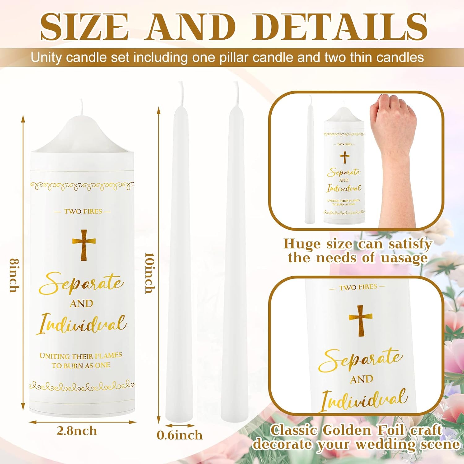 • You Will Get: the set consists of 3 wedding candles, 2 pcs of 10 inches high, and 1 pc of 8 inches high, which can have a long burning candle, suitable for the wedding table centerpiece; Special instructions: the products not include candlesticks