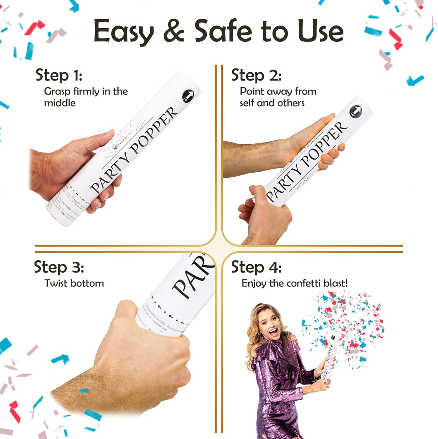 • SAFE & EASY TO USE – Designed for family-friendly fun, these air-powered confetti poppers require no fire or batteries. Just twist to release a vibrant paper burst—ideal for teens, adults, schools, and crowd-safe events