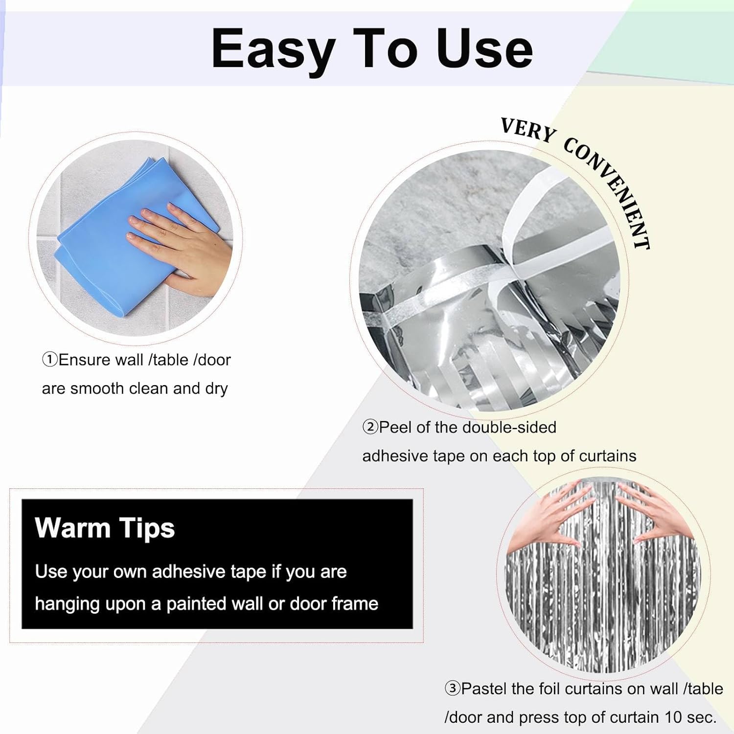 • EASY TO USE: Create a warm and inviting atmosphere in your home with just two simple steps. Step 1: Tear off the back of the double-sided adhesive tape. Step 2: Paste the foil curtain on the wall, door or table to decorate your silver party.