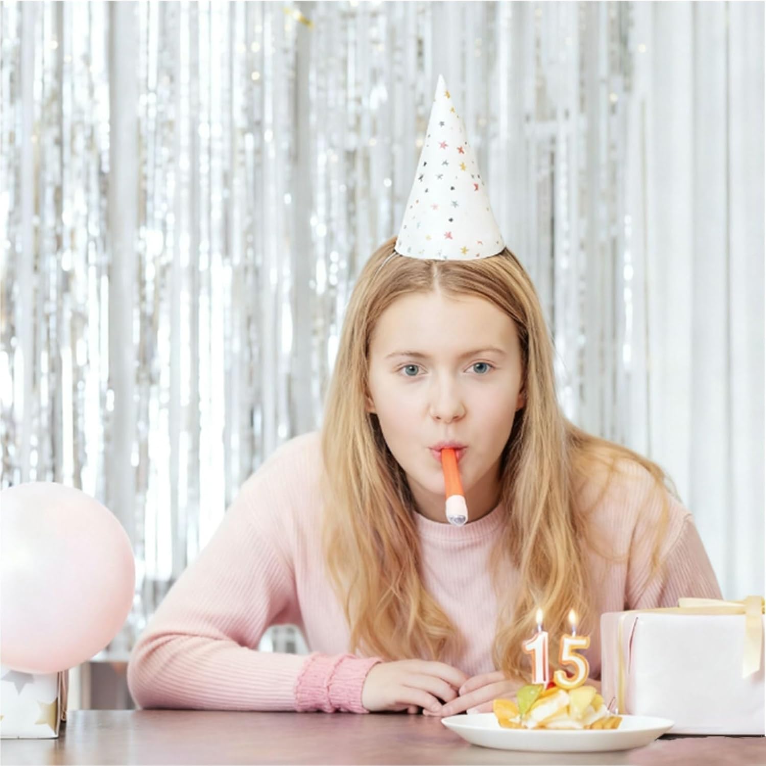 • SILVER BACKDROP: Make your party shine with 4 packs of silver foil fringe backdrop curtains. Each metallic tinsel curtain is 3.2ft (wide) x 8.2ft (drop), perfect to fit most doorways and windows with easy installation.