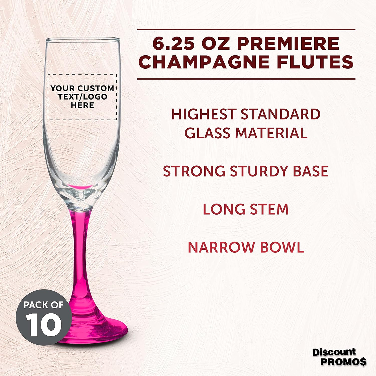 DISCOUNT PROMOS Custom Premiere Champagne Flutes 6.25 oz. Set of 10, Personalized Bulk Pack - Elegant Drinkware for Weddings, Events, & Promotional Gifts - Pink
