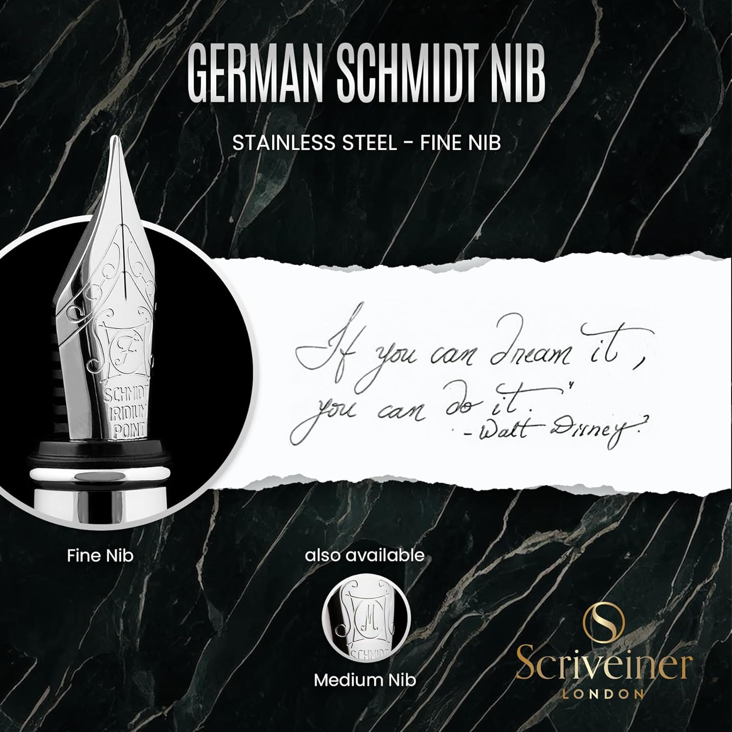 Scriveiner Black Green Fountain Pen - Stunning Luxury Pen with Chrome Finish, Schmidt Nib (Fine), Best Pen Gift Set for Men & Women, Professional, Executive, Office, Nice Pens
