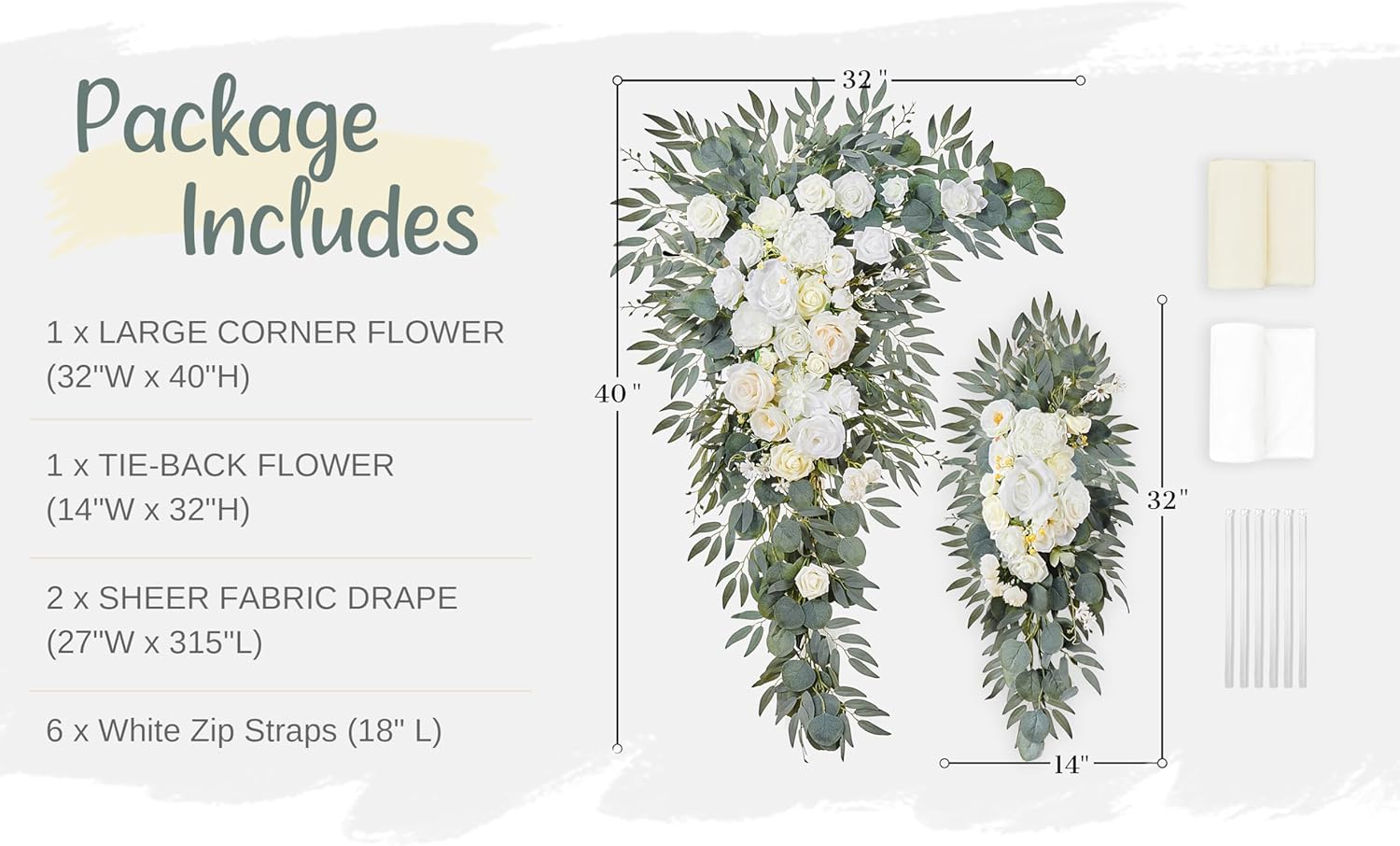• PAKEAGE LIST: 1 x Large Corner Flower Swag of 32 "W x 40 "H + 1 x Large Tie-Back Flower of 14 "W x 32 "H + 2 x Hanging Sheer Drapes of 315 x 28 inch + 6 x White Zip Straps of 17.7 inch + 1 x Instruction Card + 1 x Glue Stick (Not include wood arch stand)
