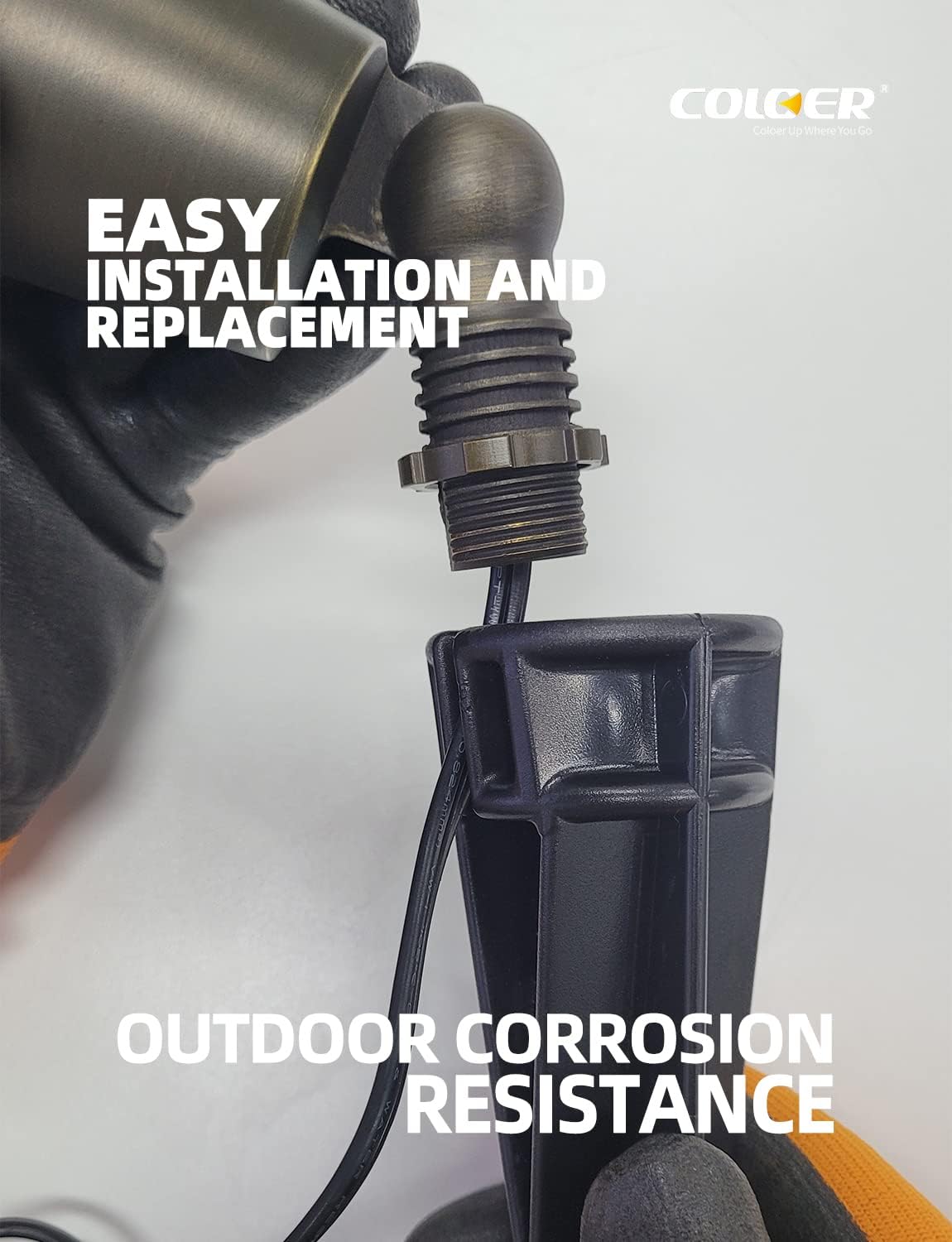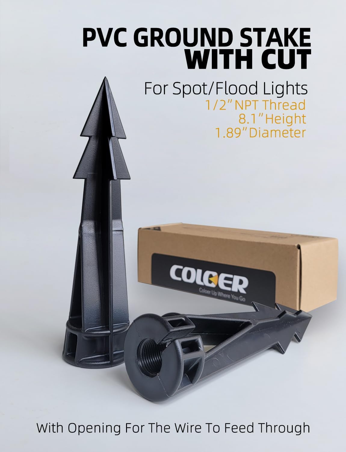 • The ground stake is 8.1" high and 1.97" diameter, 1/2" NPT thread, perfectly blend with COLOER brass spotlights, flood light and most other brand landscape lights. Medium size ground stake is long enough for secure mounting.