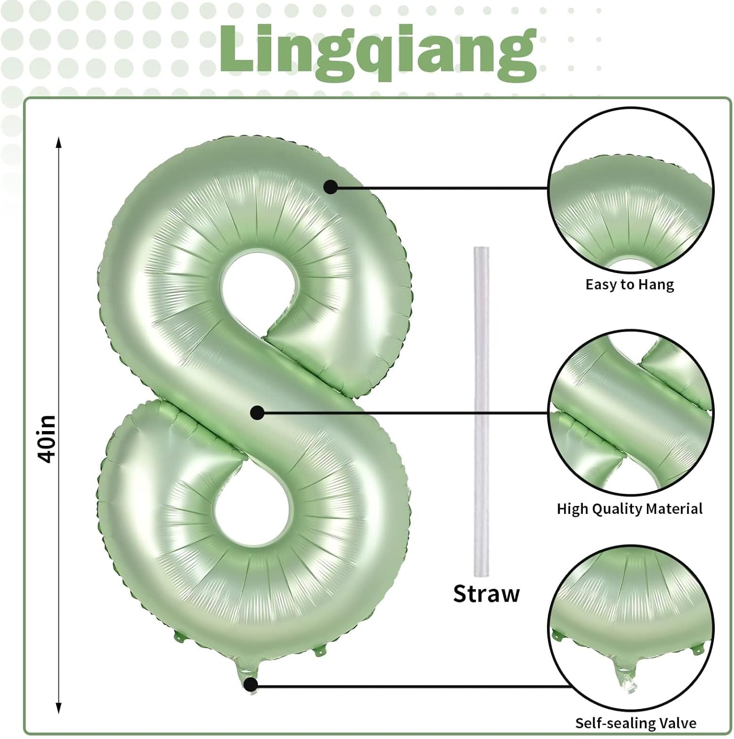 • πŸŽ‰ Easy to Inflate πŸŽ‰ - The big sage green number 8 foil balloons have self-sealing valve does not need to be knotted for easy inflation and deflation. It can be inflated with air or helium. When filled with helium, the balloons can float in the air; after filling, press the valve of the digital balloon to seal it. It can be reused. Do not throw away after use!